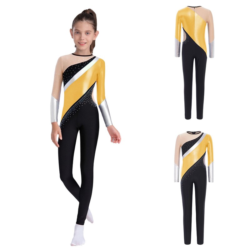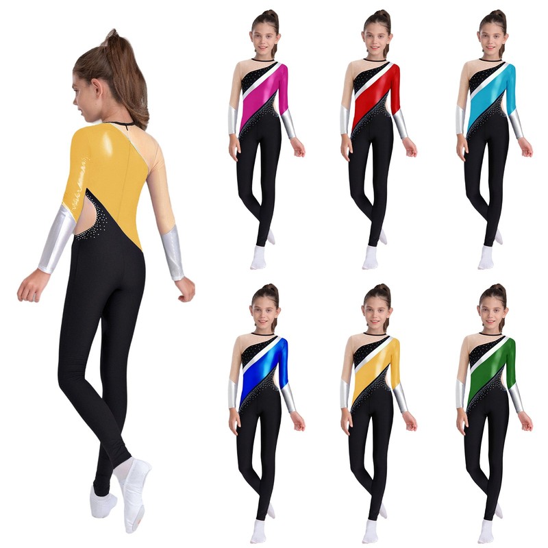 The metallic color-block design is trendy and eye-catching, making the girls stand out in any performance or competition.
