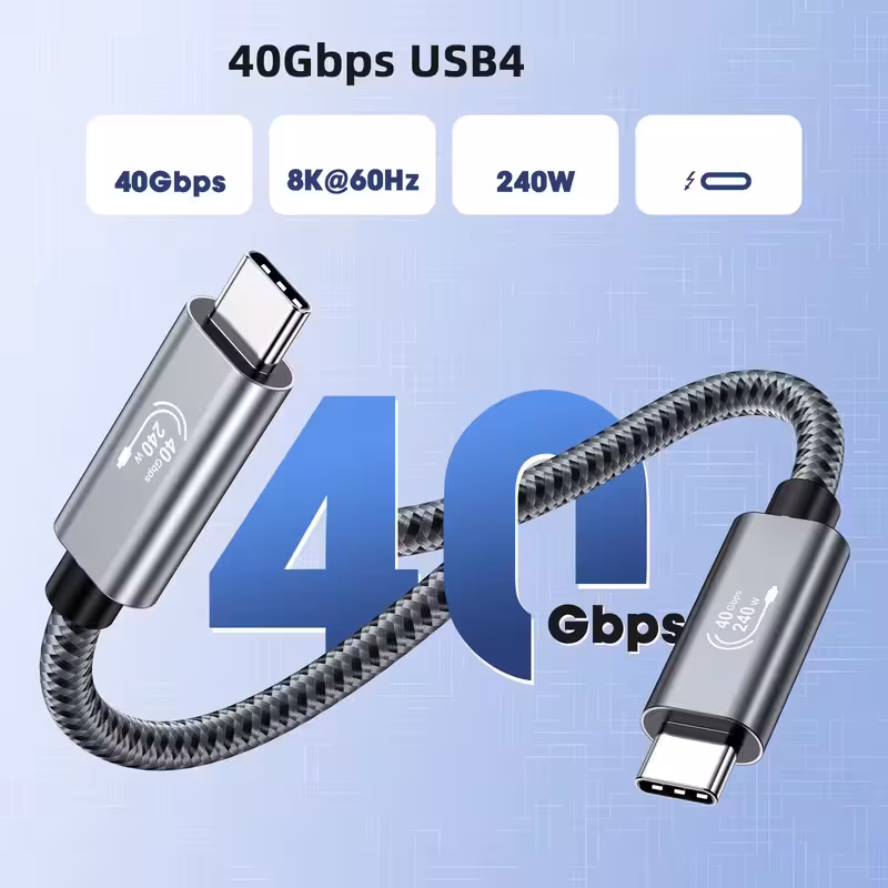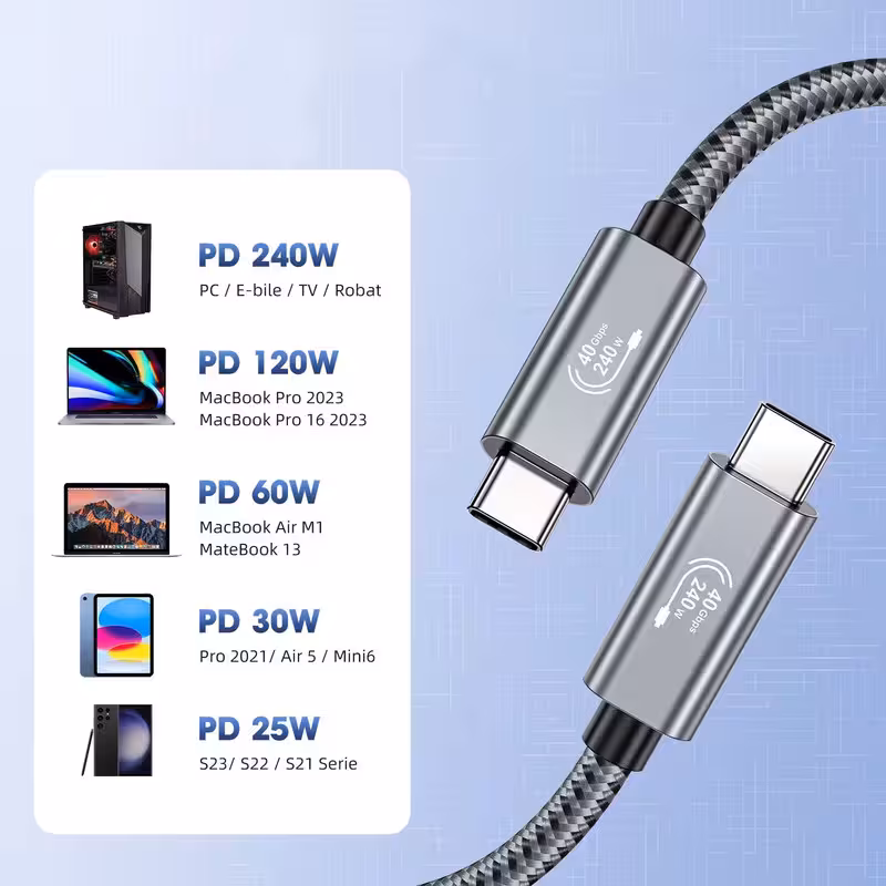 Upgrade your setup with this USB C to Type C Cable 240W 40Gbps, supporting USB4, Thunderbolt 3/4, 8K@60Hz video and PD 3.1 fast charging. Perfect for MacBook, iPad Pro, USB-C smartphones, SSD enclosures & docking stations.