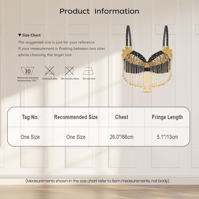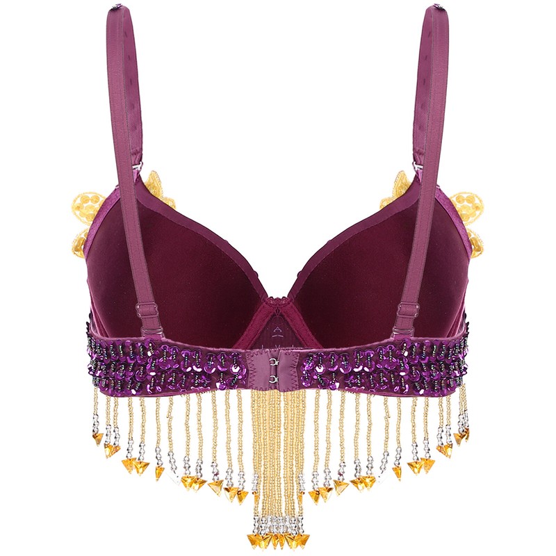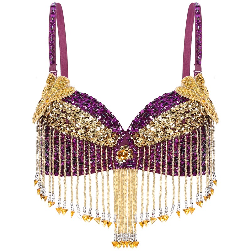 Die Blumenumrandungen aus Plastikperlen und Pailletten und die mit Plastikperlen besetzten Quasten auf dem Bauchtanz-Oberteil lassen Sie auf der Bühne umwerfend aussehen.