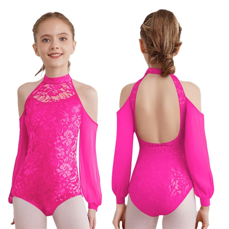 Kids Girls Lace Dance Leotards Long Sleeve Mock Neck One Piece Athletic Bodysuit