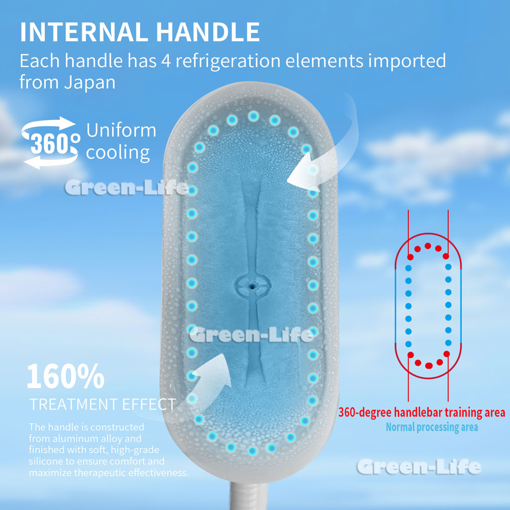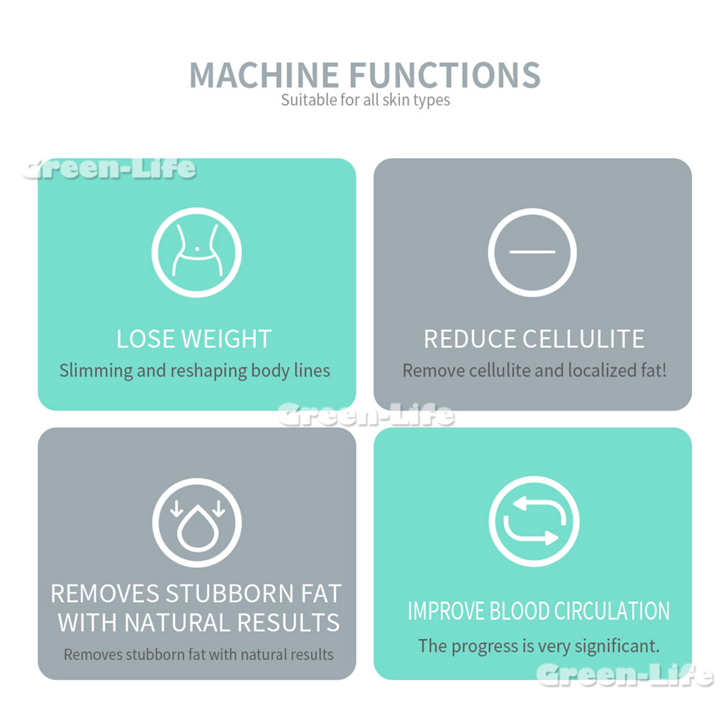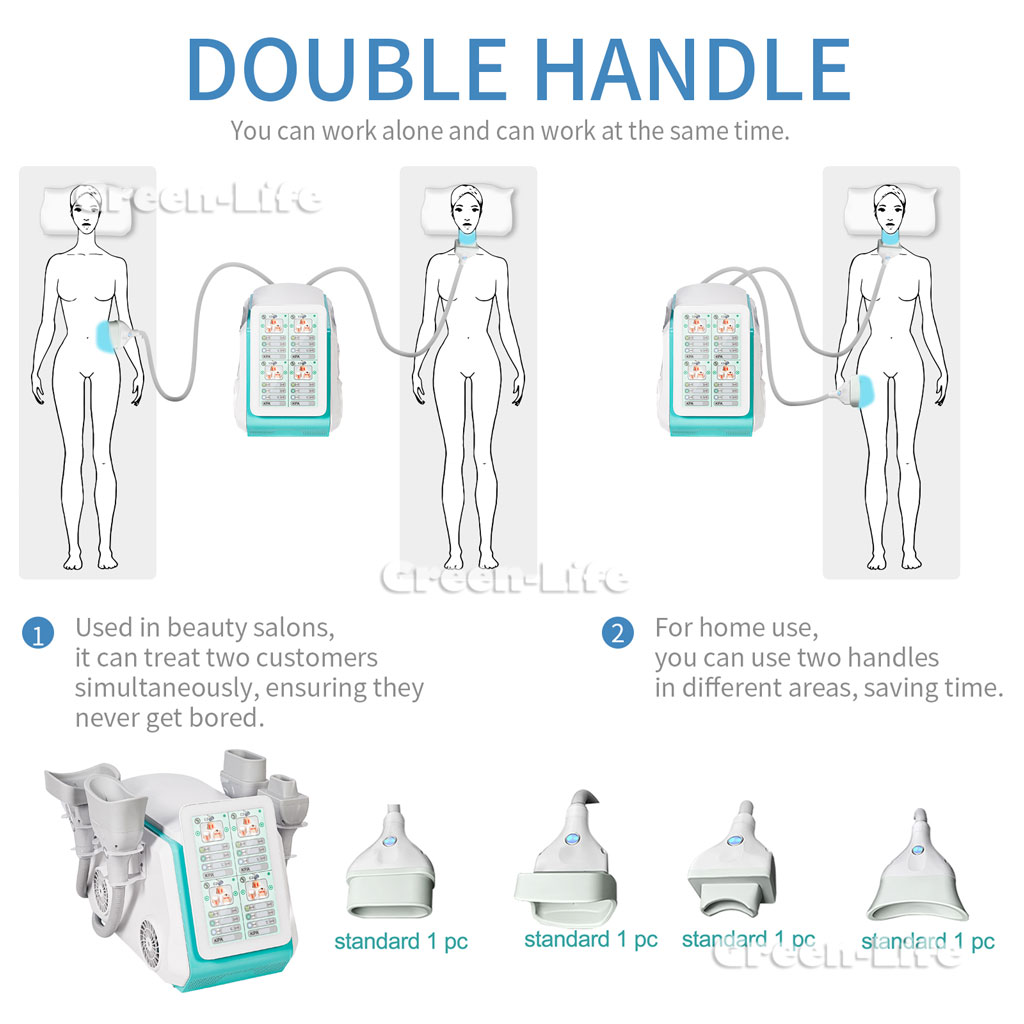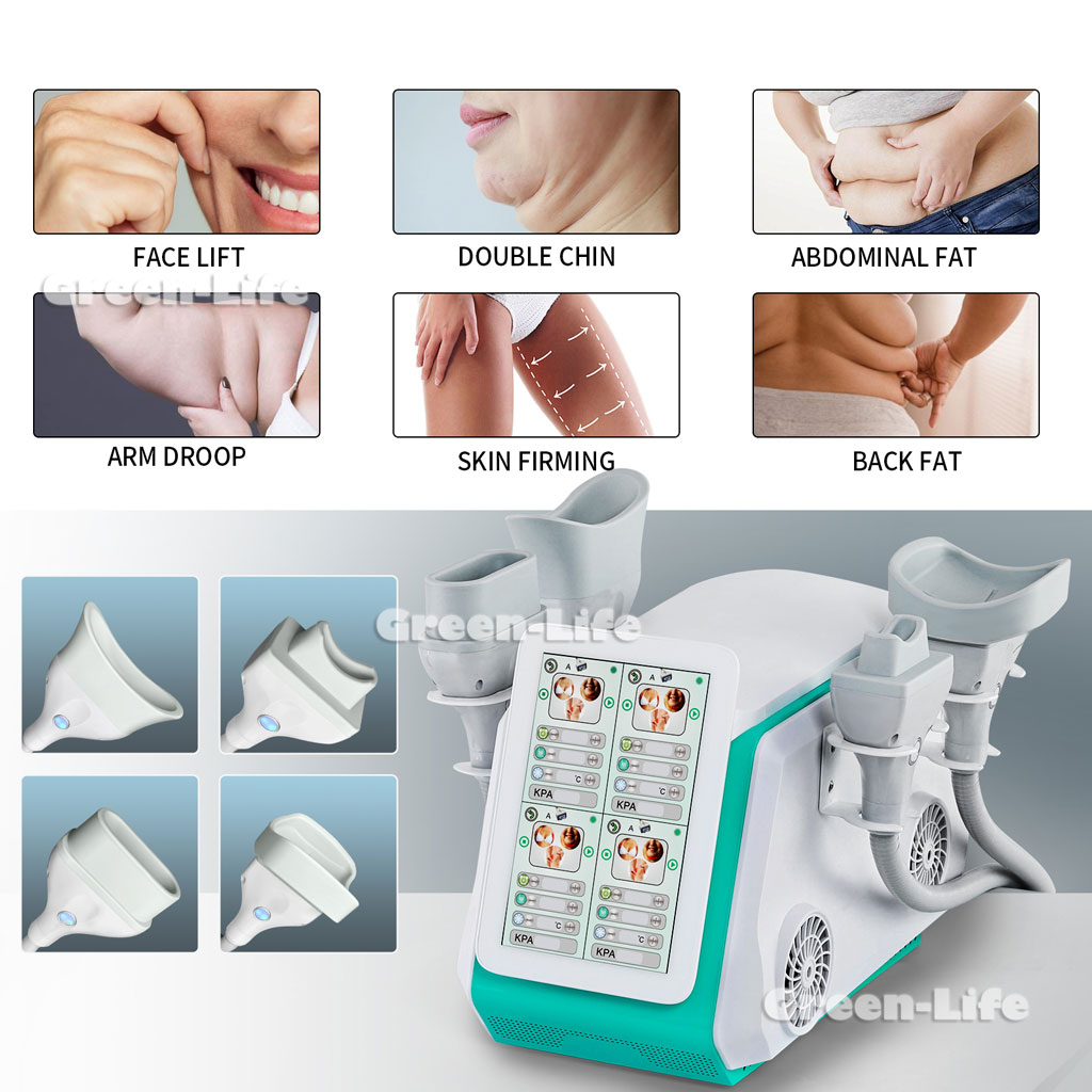 The treatment heads of different shapes and sizes are flexible and ergonomic, so as to adapt to the body contour treatment and are designed to treat double chin, arms, abdomen, side waist, buttocks (under hips). Banana), fat accumulation in thighs. and other parts.