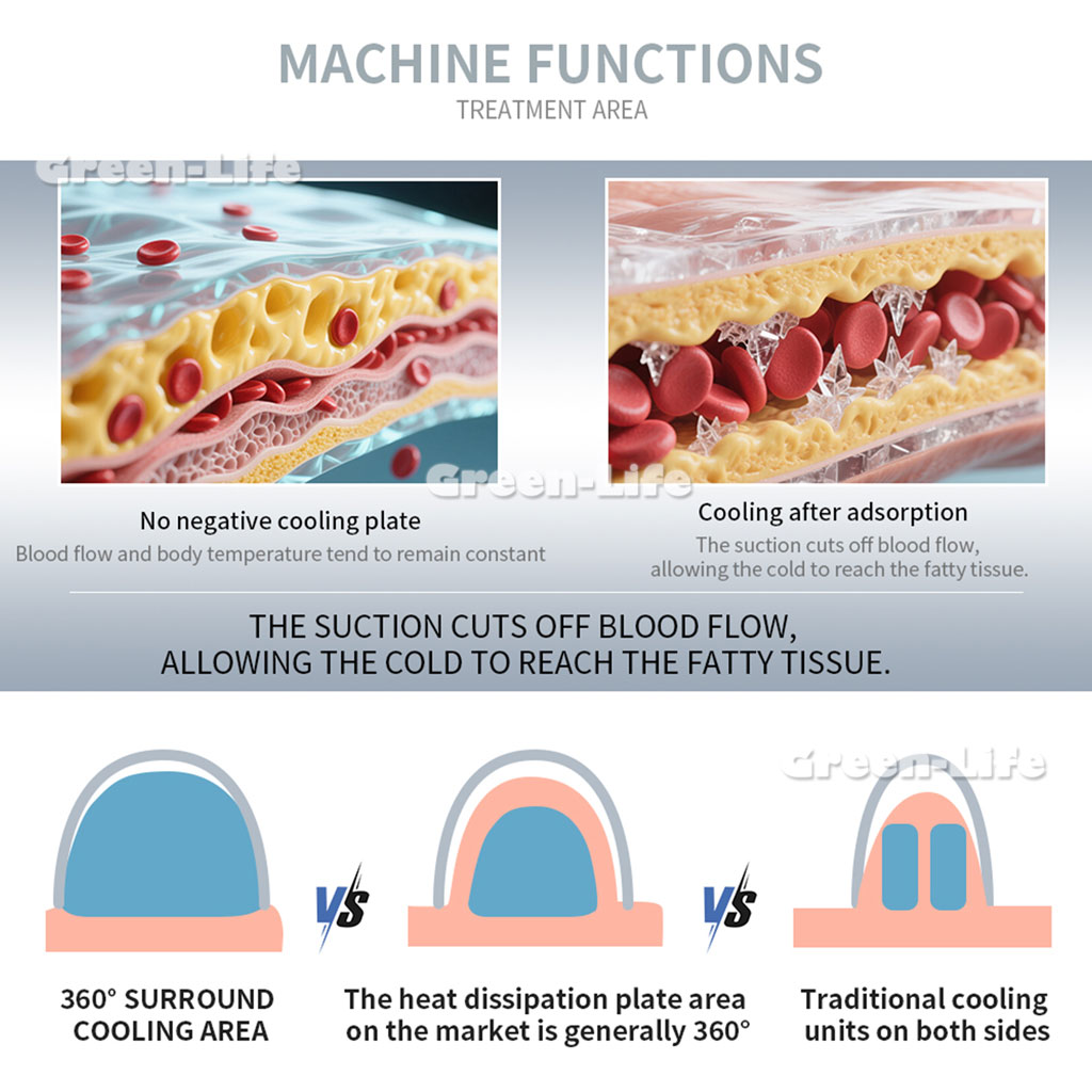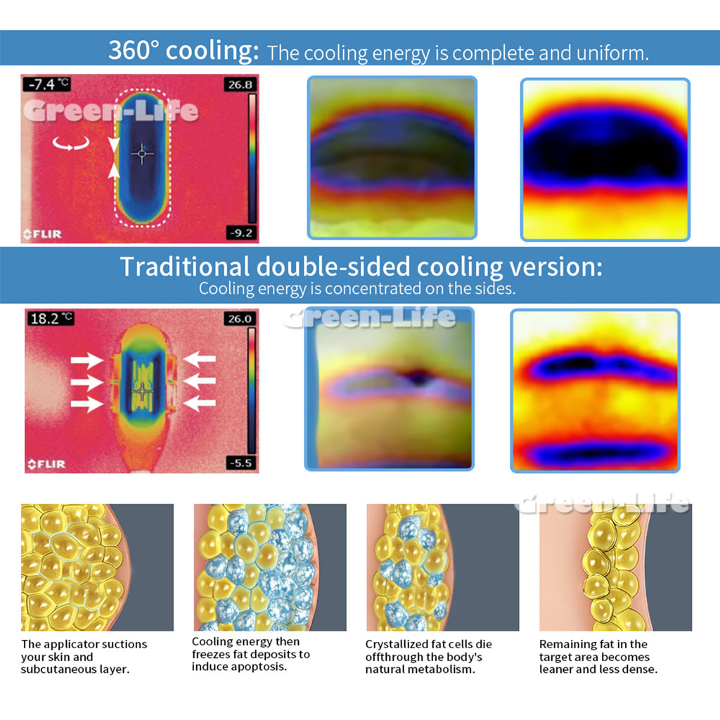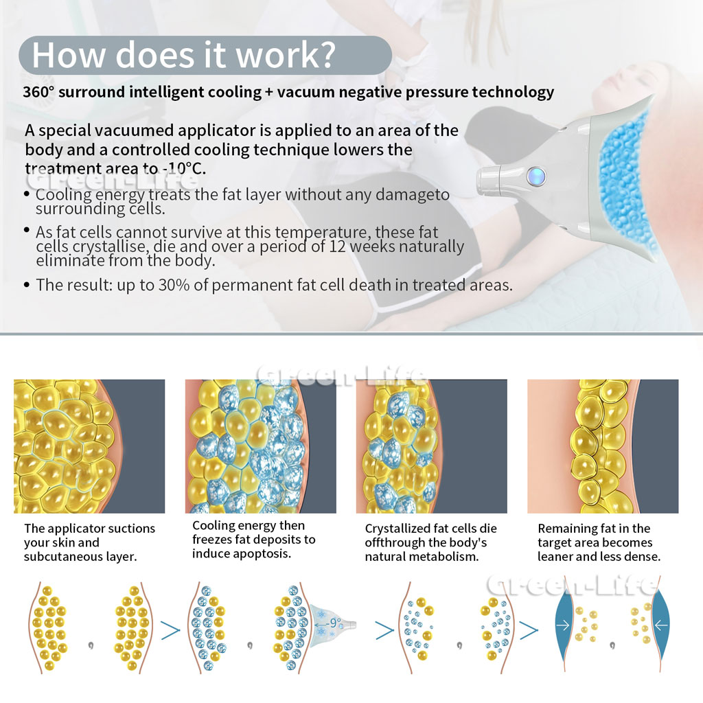 Cry-o fat freezing: fats will be accurately targeted, converted into solid at low temperatures, then be eliminated through metabolism without harming surrounding tissues, thus it can effectively reduce unwanted fat in specific areas of body.