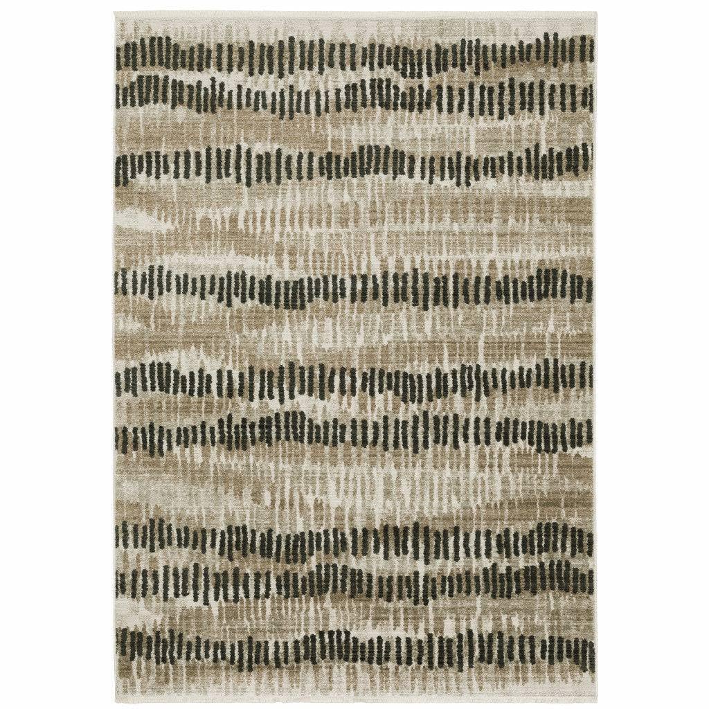 Add great coloration and comfortable texture to your space with this 5' x 8' beige ivory charcoal brown tan and grey abstract power loom stain resistant area rug with fringe. This rectangle shaped rug features a abstract design in beige ivory charcoal brown tan and grey to give it visual interest. A classic shape marries with good looking design for your space Ideal for spaces with kids and pets, this rug is stain resistant to help repel stains and spilled liquids. Tassel ends bring a timeless and fashionable look to your interior. Place this area rug against a hardwood or tile floor and it will enliven your living space with style and sophistication. 0.31" H x 62.99" W x 90.55" D