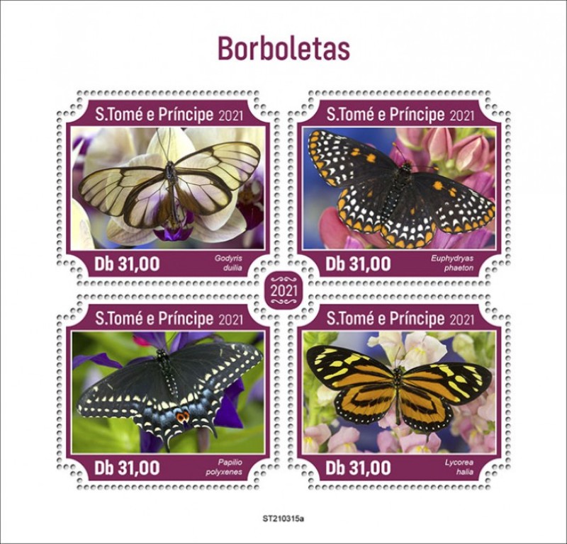 Country: St Thomas, Year of Issue: 2021, Type: 4 Stamp Sheet, Topic: Butterflies, Insect, Glasswing, Baltimore Checkerspot, Black Swallowtail, Tropical Milkweed Butterfly