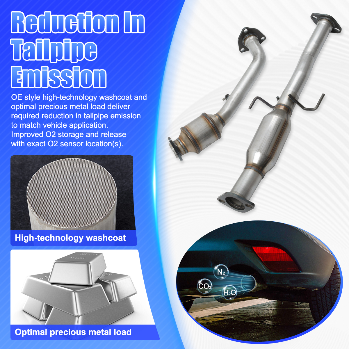 3.OE style high - technology washcoat and optimal precious metal load deliver required reduction in tailpipe emission to match vehicle application. Improved O2 storage and release with exact O2 sensor location(s).