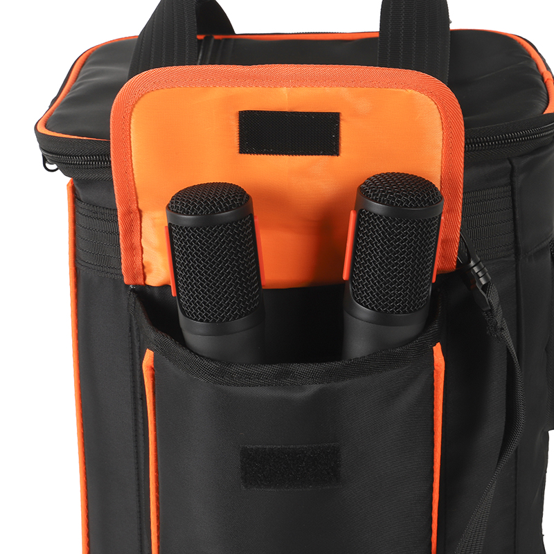 The left and right side markers each have a compartment, you can put the microphone microphone + some miscellaneous items, the front mesh design does not affect the sound quality. Back hollowed out can not affect the charging use.