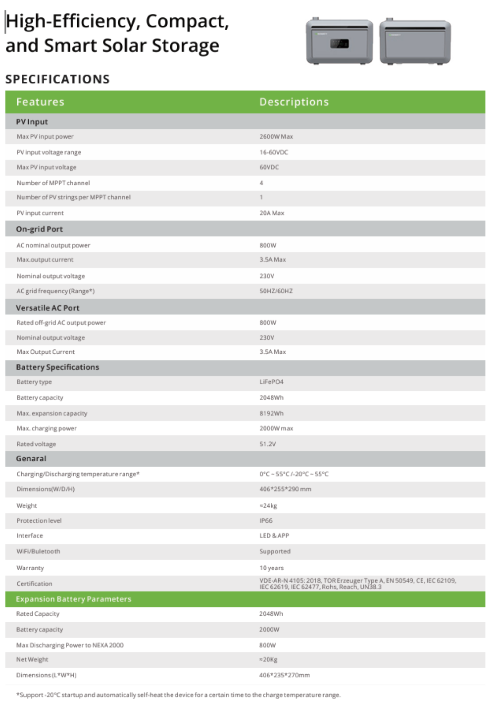 Die Installation des Stromspeichers ist innerhalb von zwei Minuten erledigt. Denn für die Inbetriebnahme benötigt es nur zwei Anschlüsse, um den NEXA 200 mit Strom zu versorgen und an Ihre Module anzuschließen. Dank der robusten Verarbeitung lässt sich der Speicher im Außen- oder auch im Innenbereich einsetzen. Die Batterie verfügt über die Schutzklasse IP66 und ist somit wasserfest. Zudem ist der Speicher selbst bei Minusgraden bis -20°C einsatzbereit.