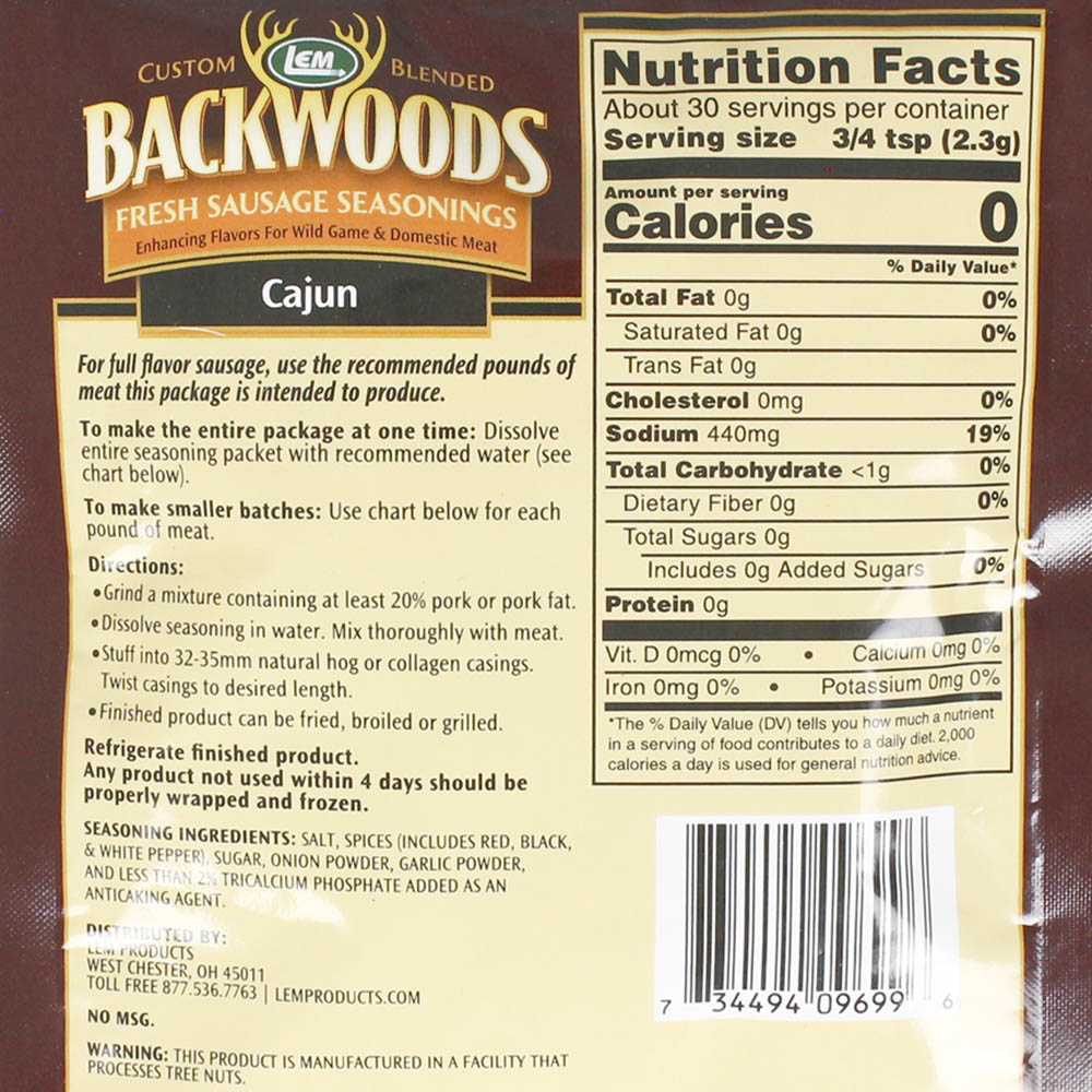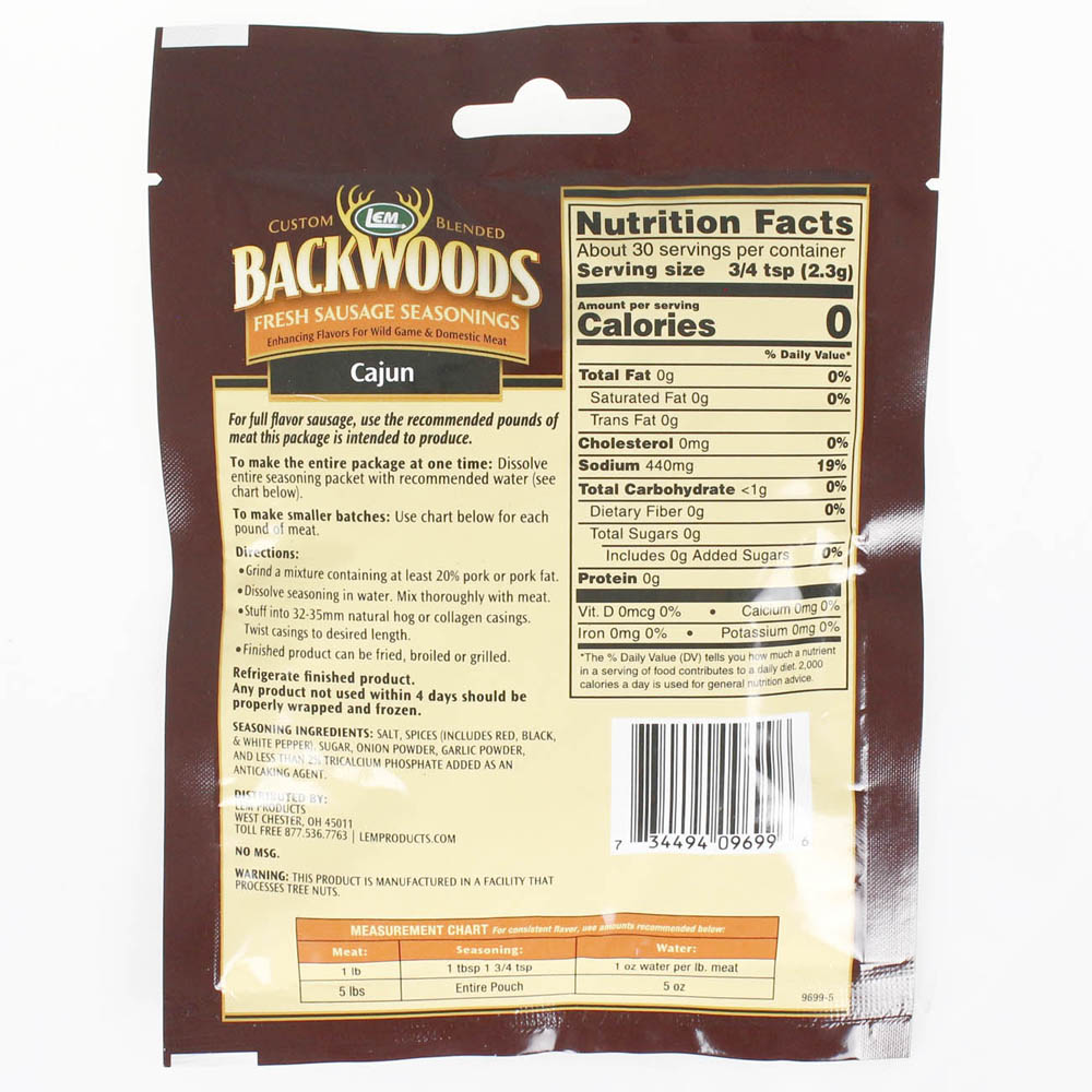 Add some serious heat to your meat with Backwoods Cajun Fresh Sausage Seasoning. This classic blend of onion, garlic, and 3 types of peppers is a real hit with Cajun lovers or anyone looking to spice up their homemade sausages! Complement the flavor of wild game or domestic meat with this perfectly-balanced blend of spices next time you crave the rustic heat of Louisiana. One pouch makes up to 5 pounds of meat.