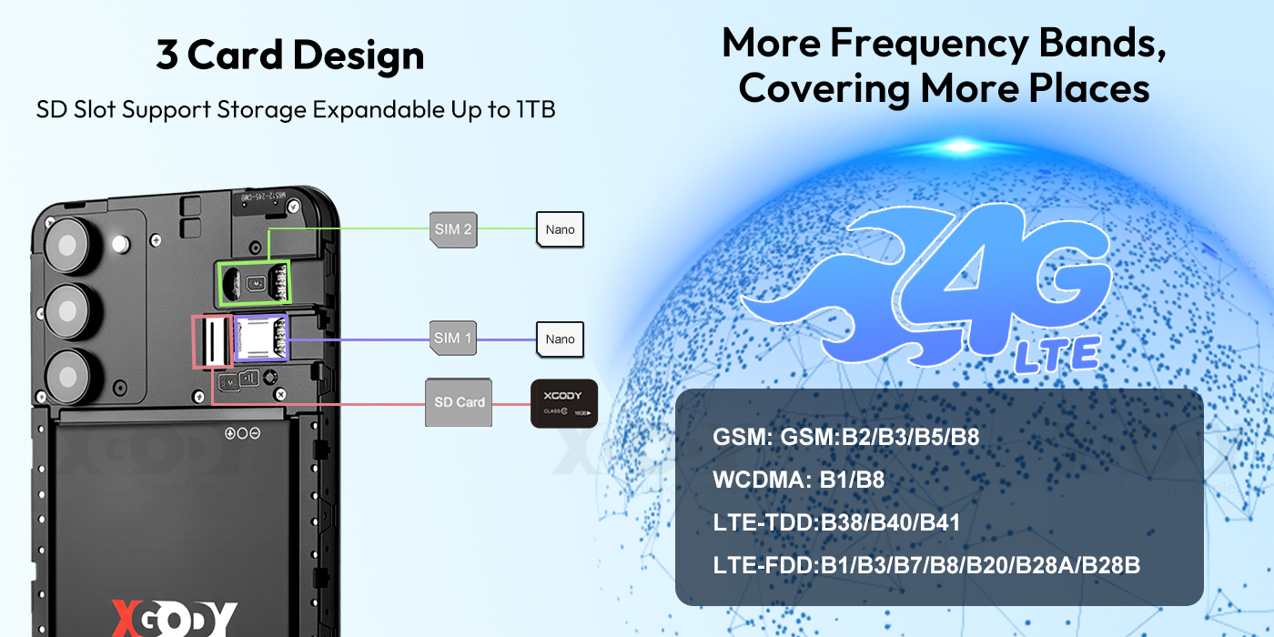 - 2+1 slots design: Nano SIM1 + Nano SIM2 (SIM Card is not included) + Up to 256GB (SD Card is not included)