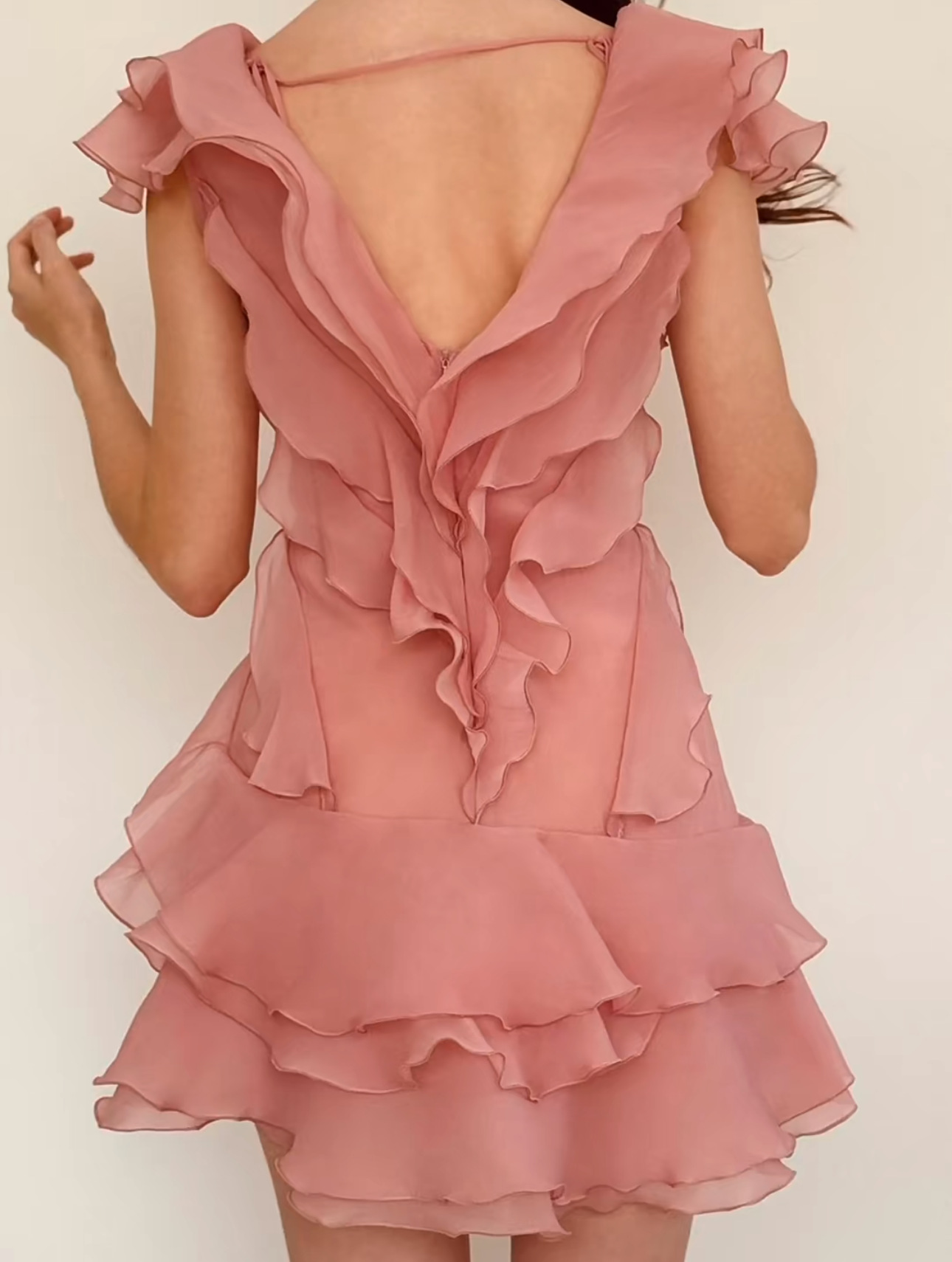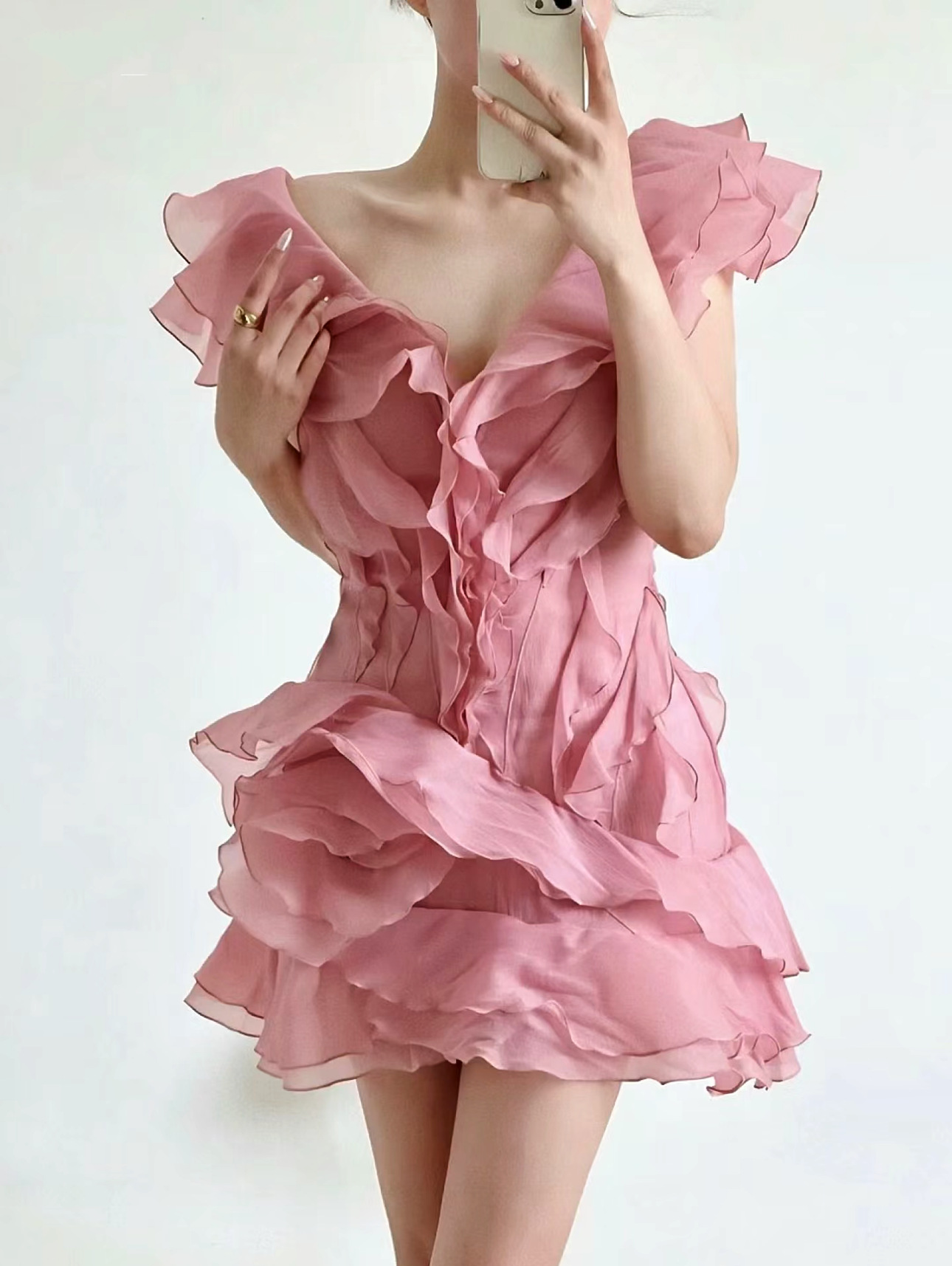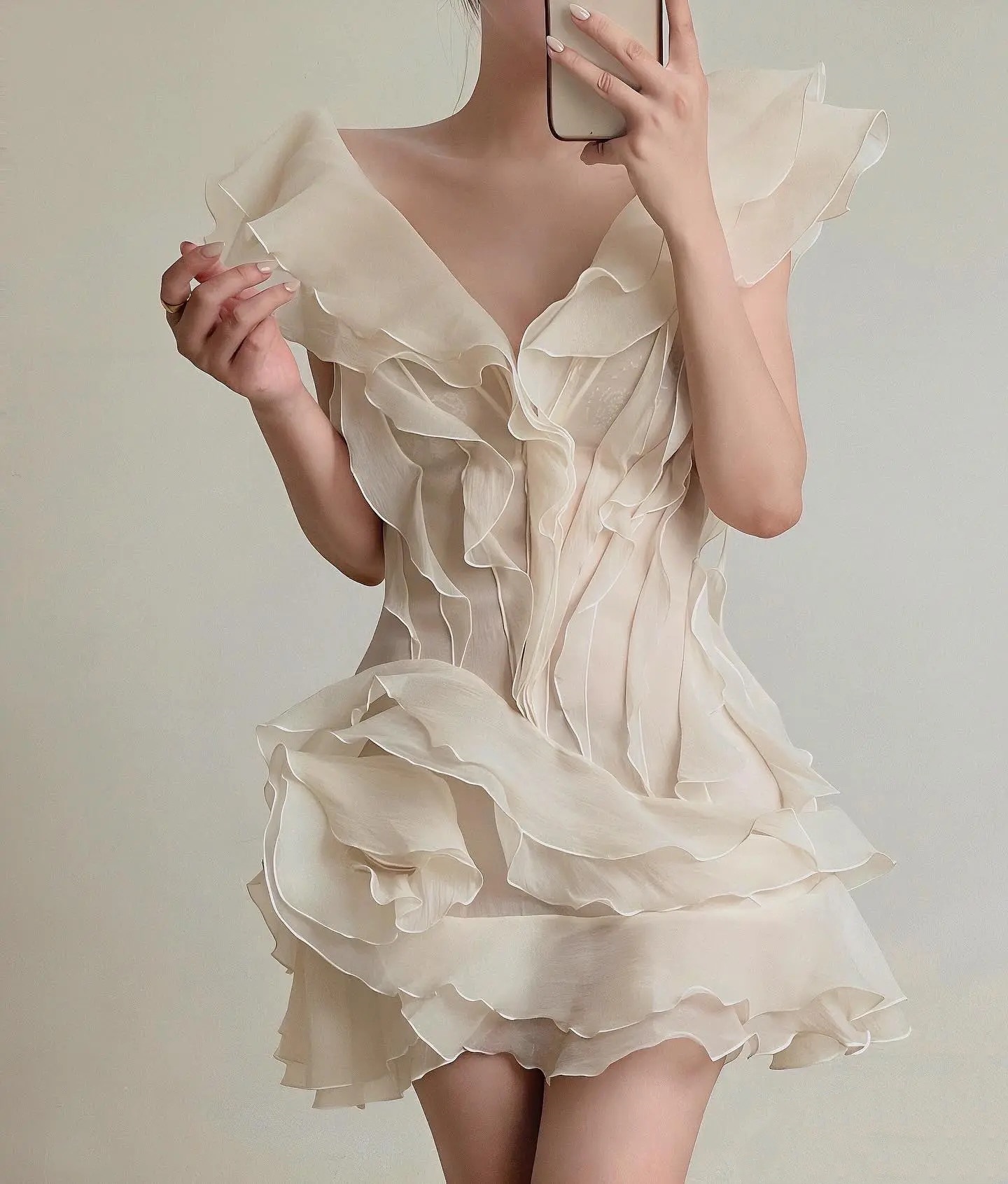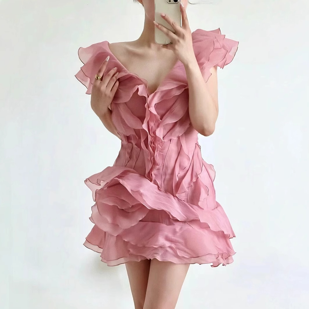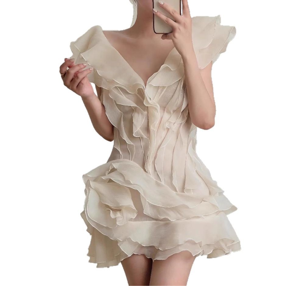 New Sexy Ladies Summer Lace Mesh V-neck Shoulder Dress Ruffled Edges Midi Dress