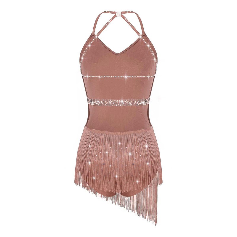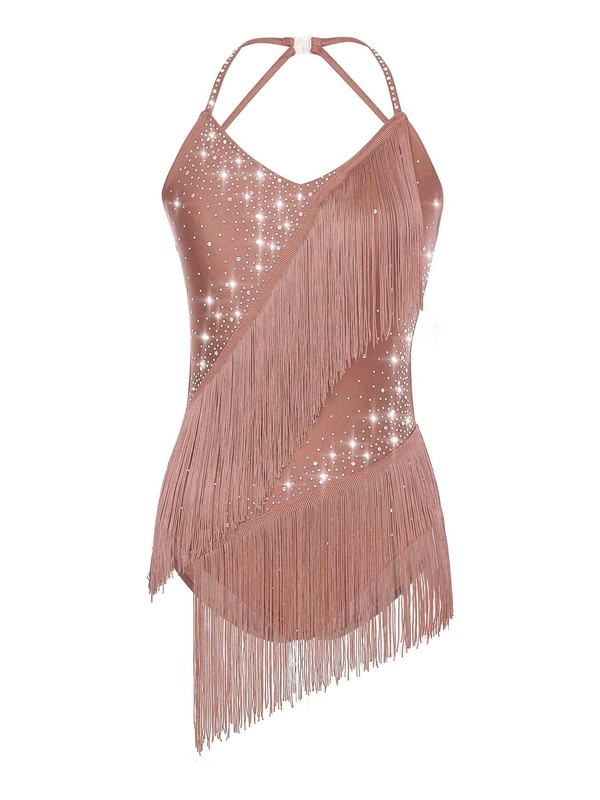 Sleeveless, halter neck with clasp closure, dance leotard is decorated with shiny rhinestones and tassels.