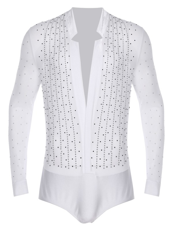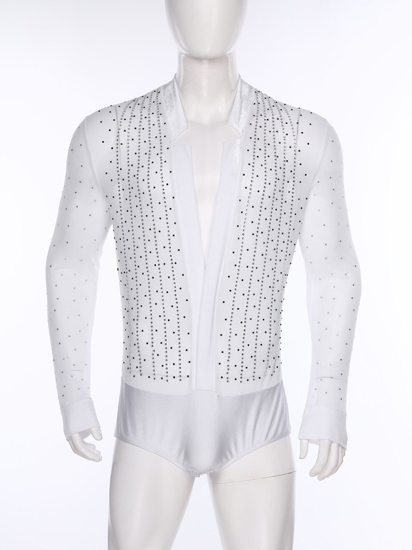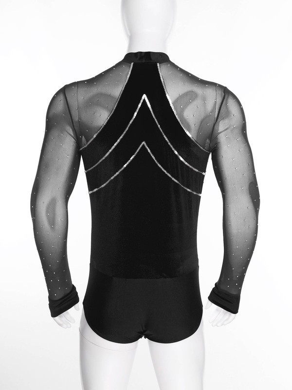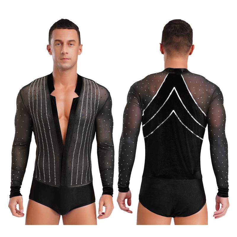 Sheer mesh and velvet patchwork with shiny rhinestones decoration bring a luxurious and glamorous feel, making you stand out on the dance floor.