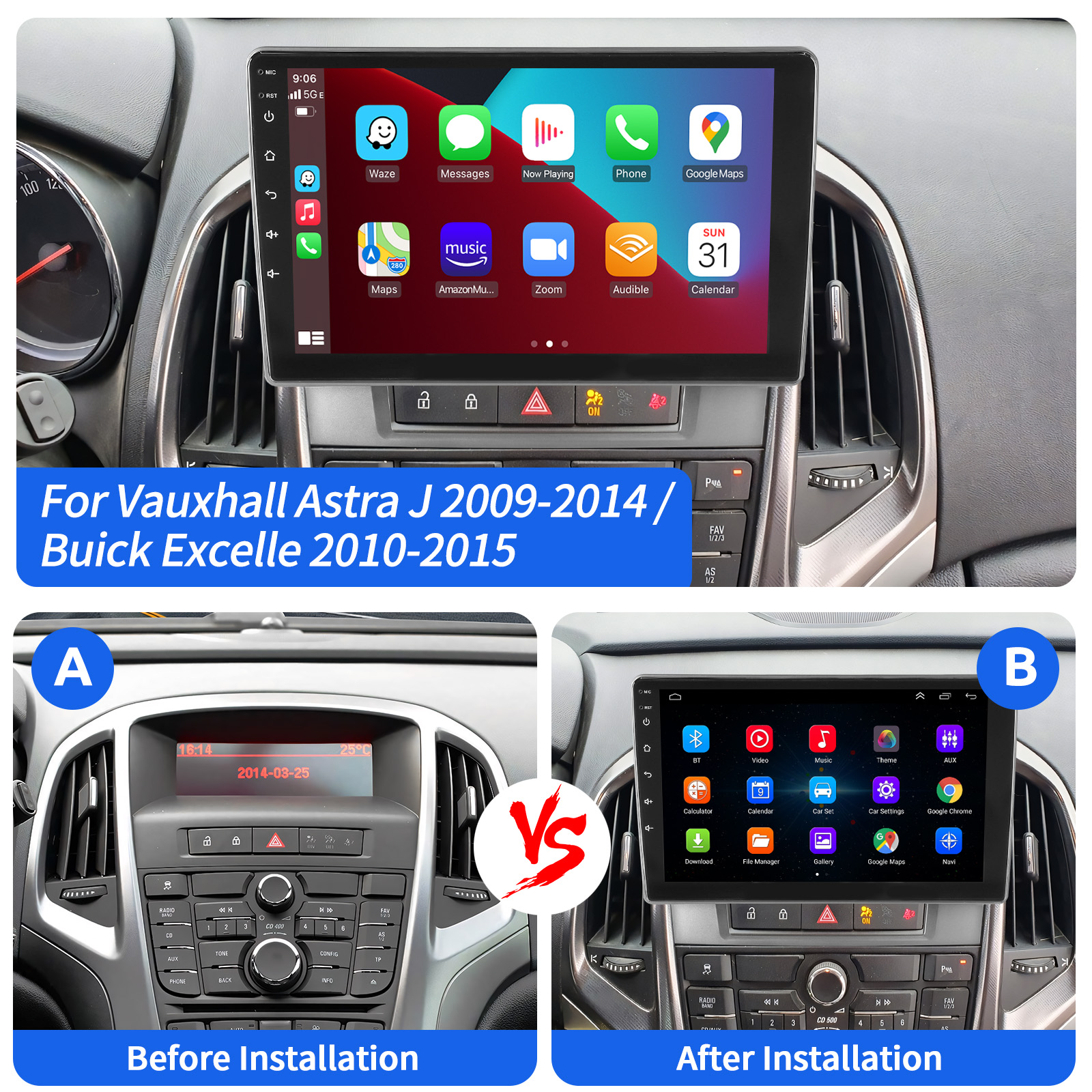 9 Inch Android 14 Car Stereo For Vauxhall Astra J: The Android car stereo with 9" 1280*720 HD IPS capacitive touch screen, 4GB RAM and 64GB ROM allows you to download your favorite apps and videos, so that driving is no longer boring. No extra frame , no need to change wires, plug and play.It comes with Canbus and supports most of the original functions: steering wheel control, reverse signals and reading original computer data, etc.