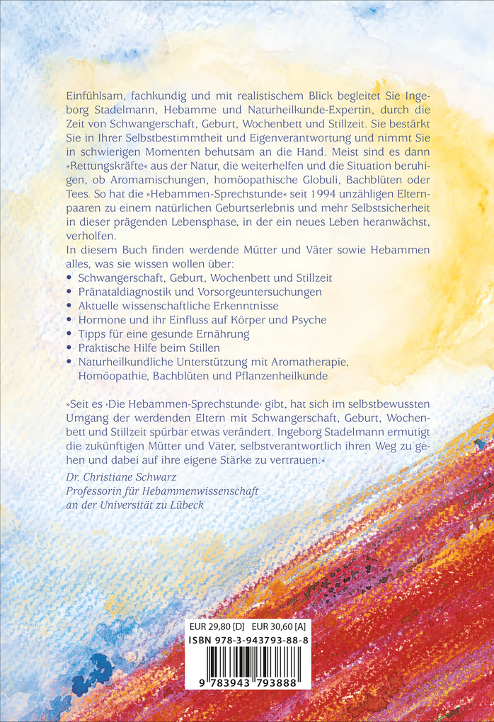 Der Bestseller 2018 erweitert und seitdem laufend aktualisiert! Alles, was sie wissen wollen über:- Schwangerschaft, Geburt, Wochenbett und Stillzeit- Pränataldiagnostik und Vorsorgeuntersuchungen- Aktuelle wissenschaftliche Erkenntnisse- Hormone und ihr Einfluss auf Körper und Psyche- Tipps für eine gesunde Ernährung- Praktische Hilfe beim Stillen- Naturheilkundliche Unterstützung mit Aromatherapie, Homöopathie, Bachblüten und PflanzenheilkundeEinfühlsam, fachkundig und mit realistischem Blick begleitet Sie Ingeborg Stadelmann, Hebamme und Naturheilkunde-Expertin, durch die Zeit von Schwangerschaft, Geburt, Wochenbett und Stillzeit. Sie bestärkt Sie in Ihrer Selbstbestimmtheit und Eigenverantwortung und nimmt Sie in schwierigen Momenten behutsam an die Hand. Meist sind es dann 'Rettungskräfte' aus der Natur, die weiterhelfen und die Situation beruhigen, ob Aromamischungen, homöopathische Globuli, Bachblüten oder Tees. So hat die 'Hebammen-Sprechstunde' seit 1994 unzähligen Elternpaaren zu einem natürlichen Geburtserlebnis und mehr Selbstsicherheit in dieser prägenden Lebensphase, in der ein neues Leben heranwächst, verholfen.