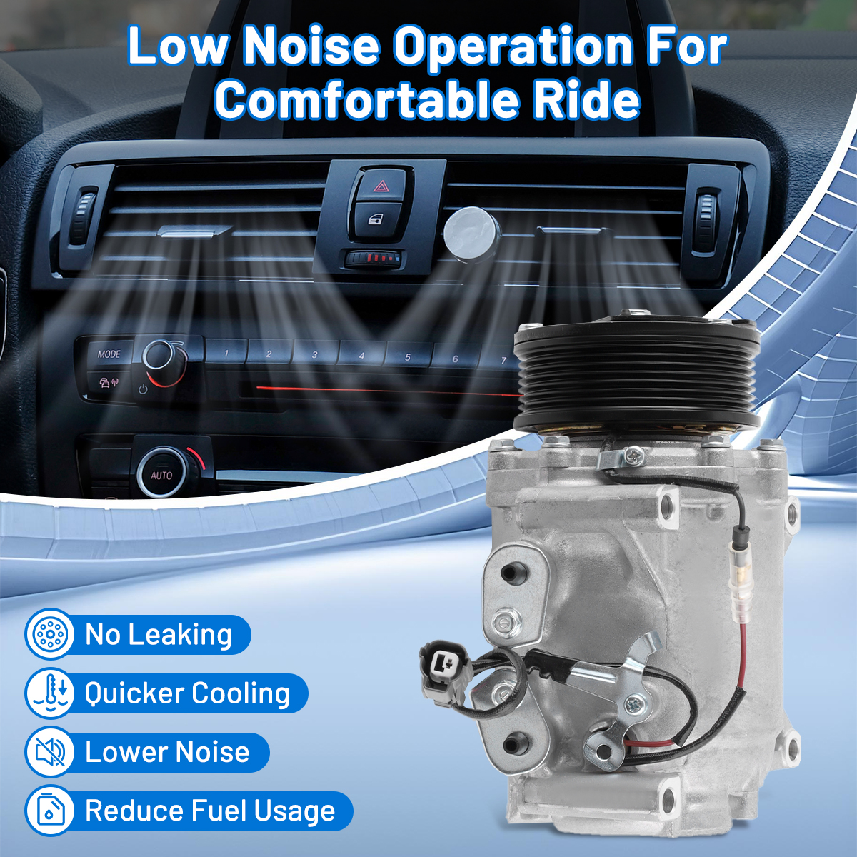 Our AC compressor kit works efficiently under low noise and tiny vibration to provide you a super cool trip. Driving at a stable speed will help reduce fuel consumption.