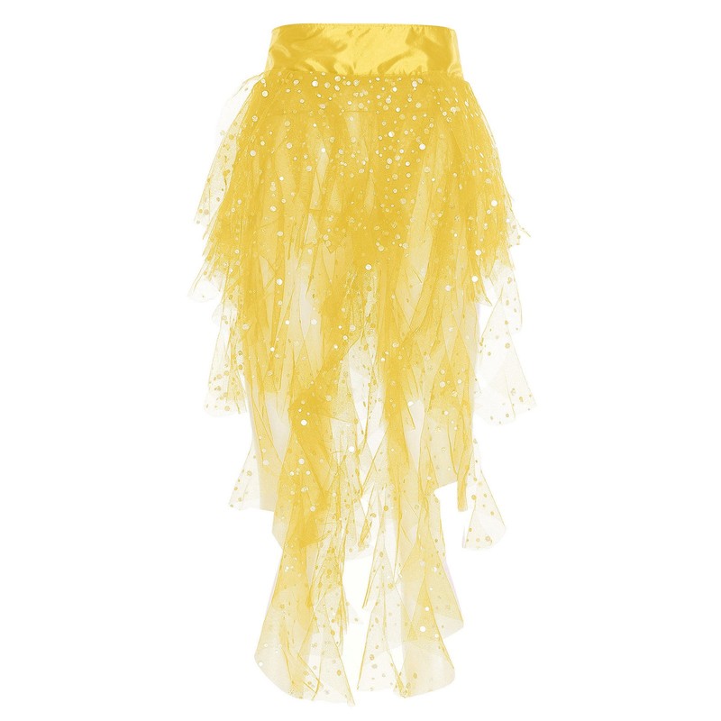Die kaskadenförmigen Rüschen und der paillettenbesetzte Tüll verleihen einen Hauch von Glamour und Glanz und machen den Rock zu einem trendigen und auffälligen Stück für jeden Tanzanlass.
