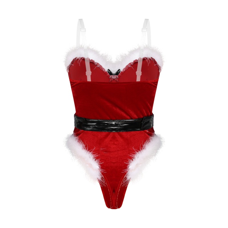 The bodysuit with white faux fur trimming, 2 decorative fluffy balls, fits the theme of Christmas and enhances the festive atmosphere.