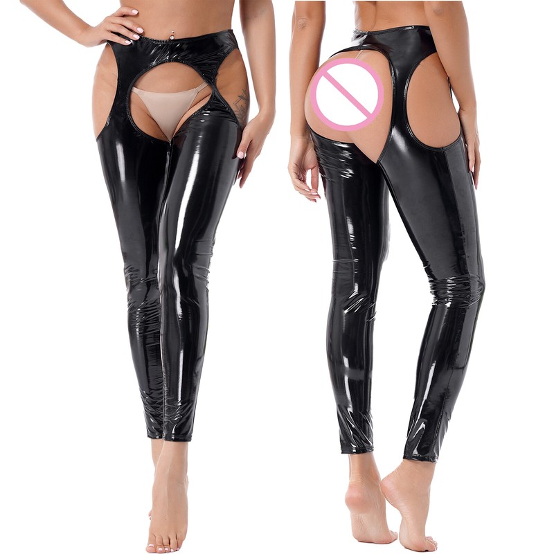 Womens Wet Look High Waist Cutout Leggings Crotchless Open Butt Patent Leather Skinny Pants.