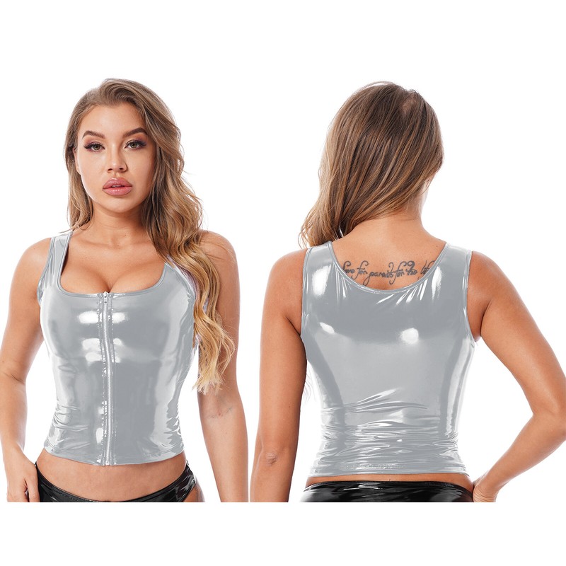 Womens Fashion Zipper Patent Leather Tank Top Wet Look U Neck Sleeveless Vest.