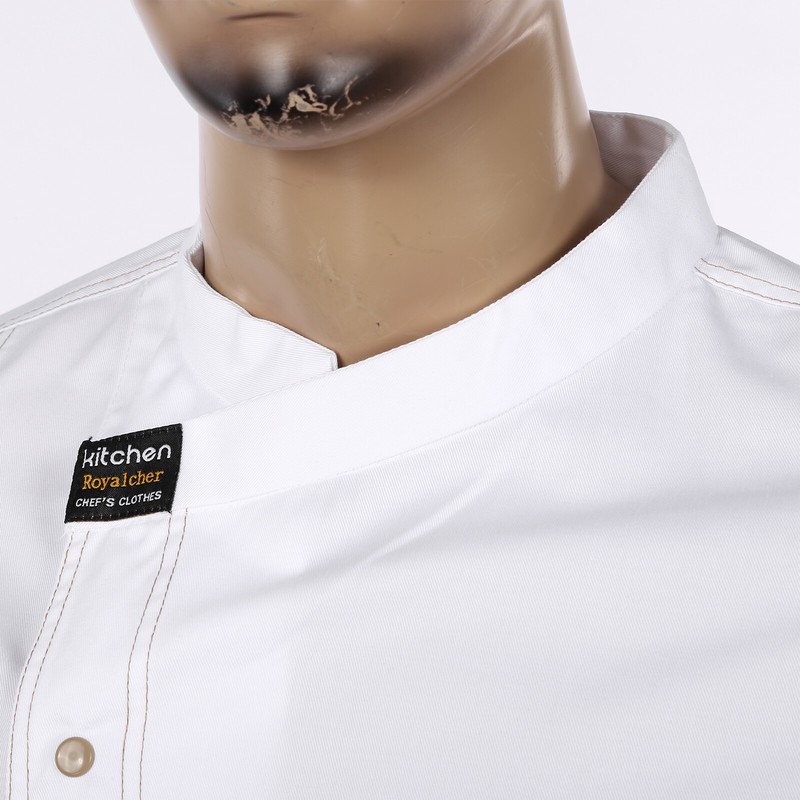 Short sleeve chef coat for men, the neckline is designed with letter embroidery, button closure, easy to put on and off.