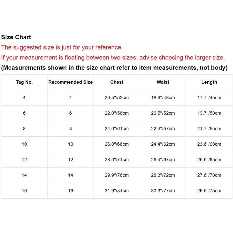 Size Chart:The suggested age and height is just for your reference. If your measurement is floating between two sizes, advise choosing the larger size. (Measurements shown in the size chart refer to item measurements, not body.)