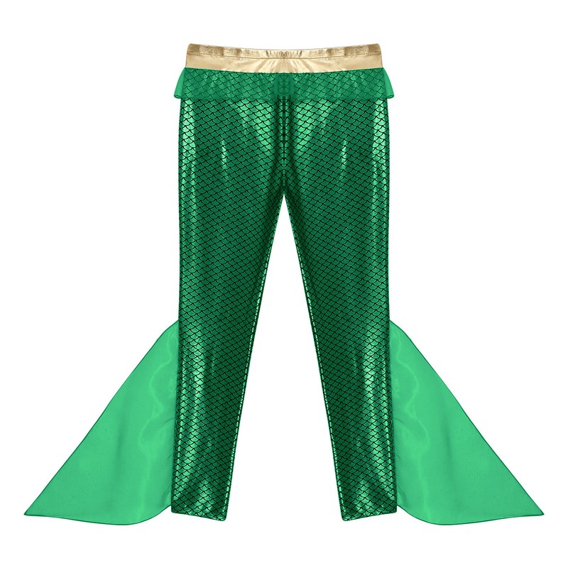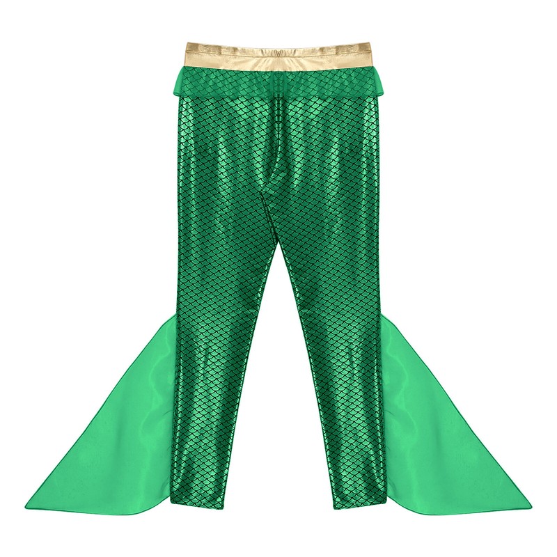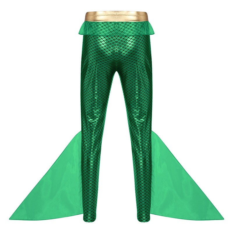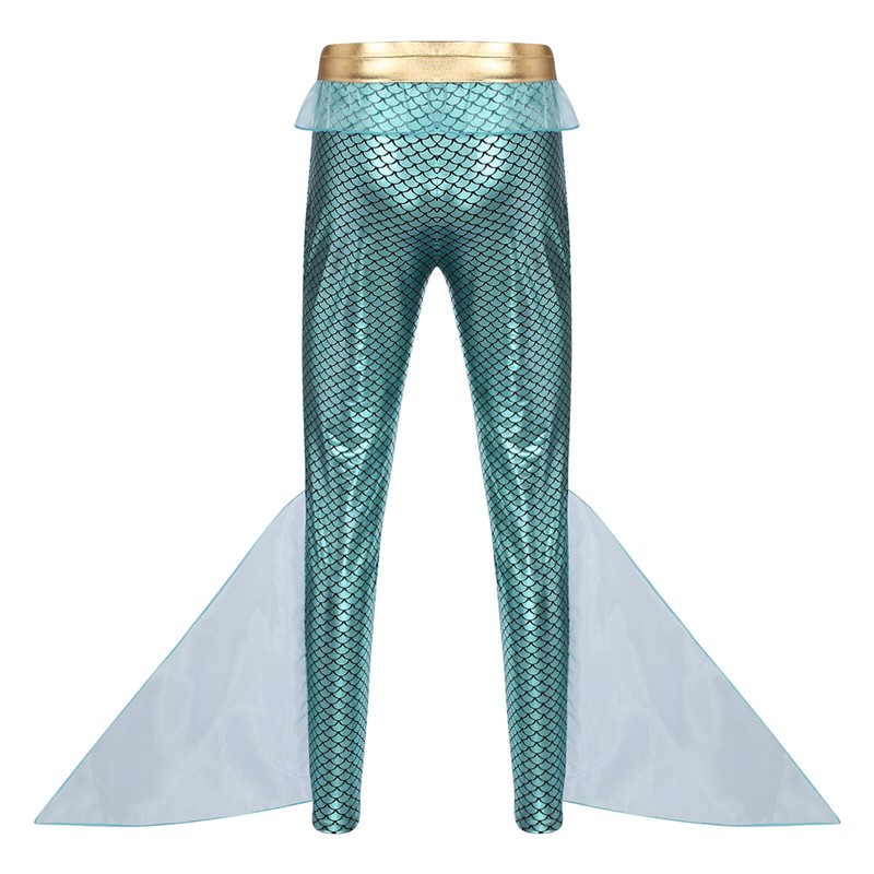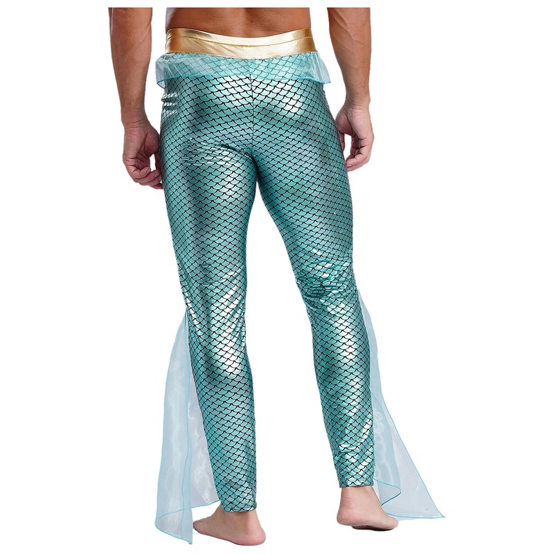 Tights for men are designed with elastic waistband, metallic shiny surface, fish-scale printing, ruffled tulle trims on waist and legs.