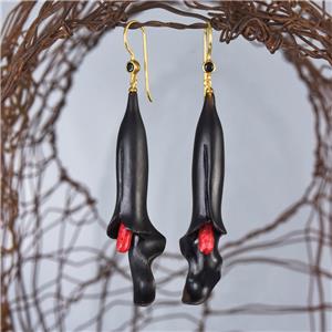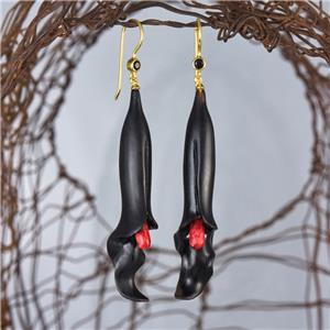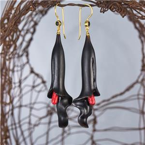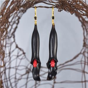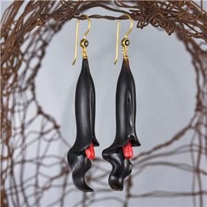 FLOWER EARRINGS CARVED BLACK HORN, RED SPONGE CORAL, SPINEL & GOLD VERMEIL STERLING SILVER