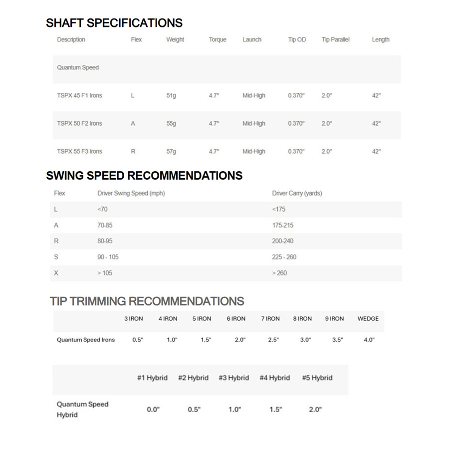 The new Quantum Speed is perfect combination of ultra light weight performance with precise control and feel. Manufactured using an exclusive blend of high modulus carbon fibers and toughened resin systems to achieve optimum performance in an ultra lightweight golf shaft. Weight, Flex, and Flex profile all optimized for increased club head speed and consistency from the driver to wedge.