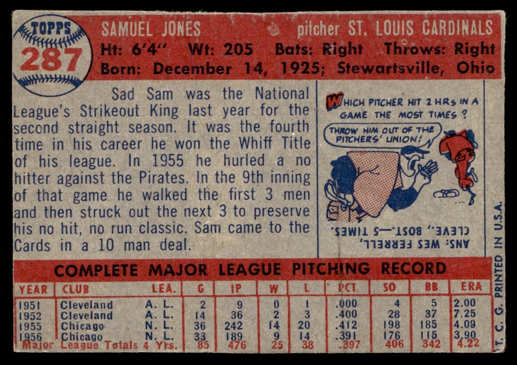 1957 Topps Sam Jones St. Louis Cardinals #287