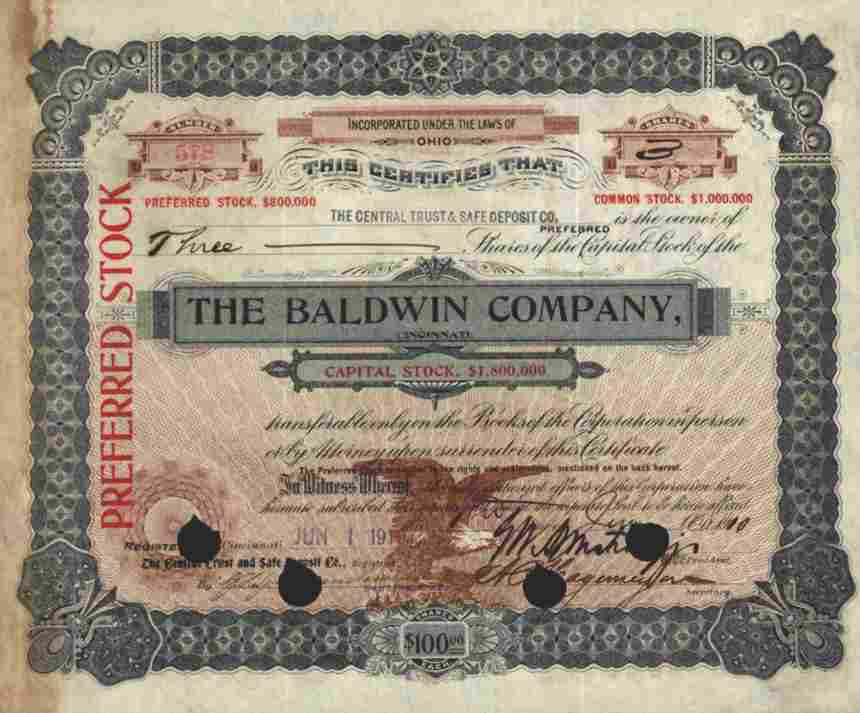 RARE und ALTE PIANO - Aktie ## EINZELSTÜCK ### Originalaktie (Preferred Stock)-- siehe Bild -- über 3 shares der Baldwin Company, Cincinnati - Ohio, vom 1. Juni 1910 !! Die Baldwin Piano Company war der größte US-amerikanische Hersteller von Tasteninstrumenten, zumeist Klavieren. Das Unternehmen ist heute eine Tochtergesellschaft der Gibson Guitar Corporation, jedoch wurde die amerikanische Fertigung, in Trumann - Arkansas, von Klavieren im Dezember 2008 eingestellt. Ursprung bereits 1857, als Dwight Hamilton Baldwin in Cincinnati, Ohio Musikunterricht für Klavier, Orgel und Violine anbot. 1862 begann Baldwin als Klavierhändler für Decker Brothers zu arbeiten und stellte 1866 Lucien Wulsin als Bürogehilfen ein. Wulsin wurde Partner im Handel, seit 1873 bekannt als D.H. Baldwin & Company. Unter Führung Wulsins wurde die Baldwin Company in den 1890er Jahren der größte Klavierhandelsbetrieb im Mittleren Westen der USA. 1963 kaufte das Unternehmen den deutschen Klavierhersteller C. Bechstein Pianofortefabrik in Berlin auf und blieb sein Eigentümer bis 1986. Baldwin ist seit 2005 eine Tochtergesellschaft der Gibson Guitar Corporation und fertigt Instrumente unter den Markennamen Baldwin, Chickering, Wurlitzer, Hamilton und Howard. Baldwin kaufte zwei Klavierfabriken in China, um dort Flügel und Pianinos zu bauen. Die Baldwin-Hamilton-Studiomodelle B243 und B247, die bekannten Schulklaviere, werden in der Fabrik in Zhongshan, China gefertigt. Die weitaus größere Fabrik in Dongbei baut Flügel und Klaviere in vielen neuen Modellen. Alle neuen Modelle werden nur unter dem Namen „Baldwin“ verkauft, nicht als Wurlitzer, Hamilton oder Chickering. Selten angeboten !!!! Orginalunterschriften. - SIEHE BILD - Sammlerfreundlicher Sonderpreis !
