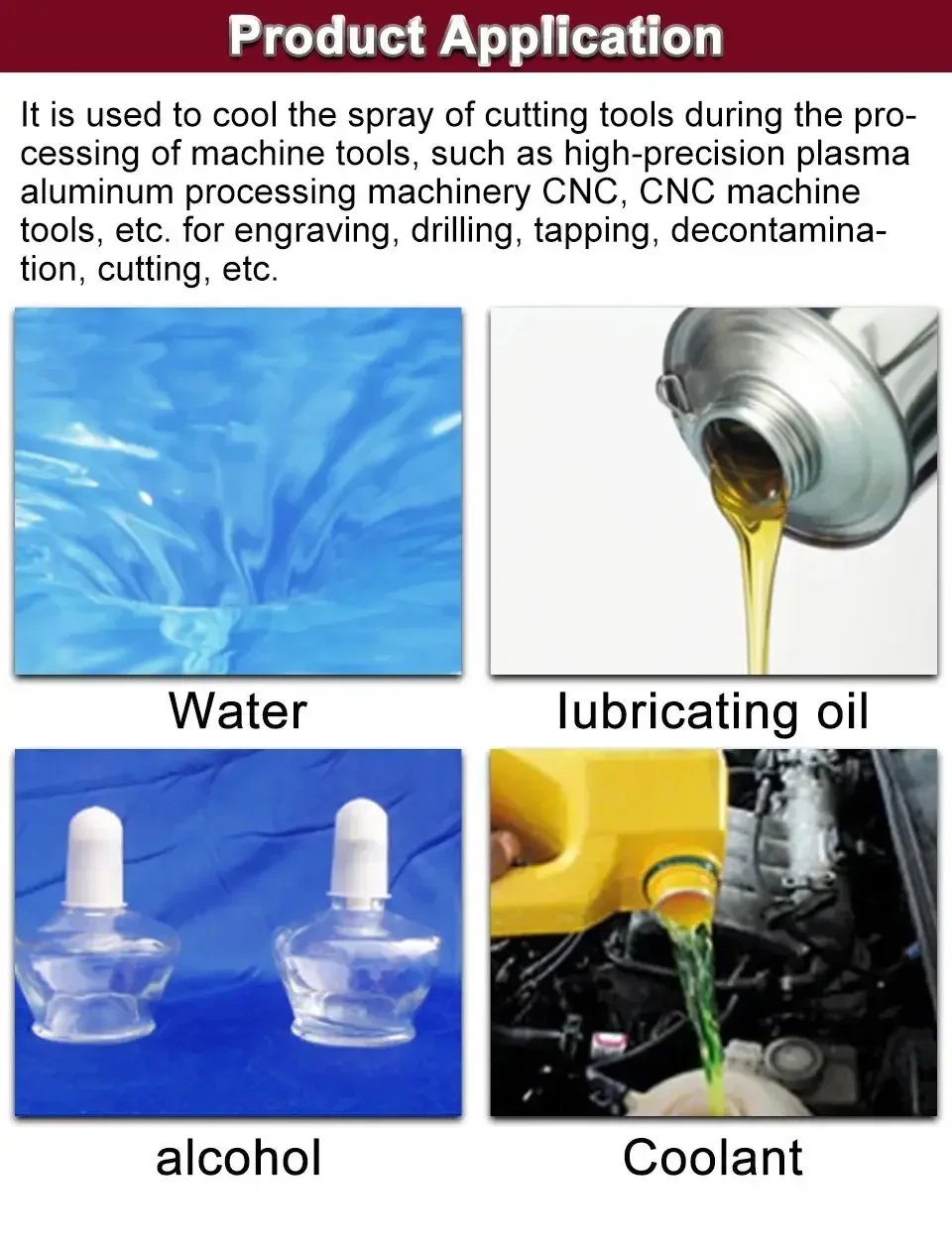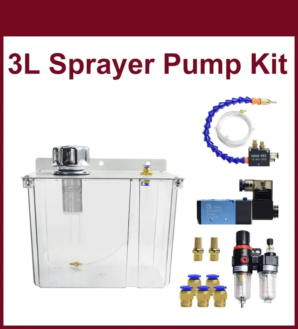 Capacity: 3L Sprayable materials: water, lubricating oil, alcohol, coolant. Whole Set :3L Water tank,Solenoid valve, spray, oil-water separator, PU gas pipe