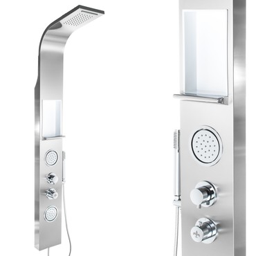 Um allen Ansprüchen unserer Kunden gerecht zu werden, gibt es dieses stilvolle Duschpaneel in verschiedenen Ausführungen. Standardmäßig wird das Paneel mit einem Einhebelmischer geliefert. Mit dem Einhebelmischer können Sie die Durchflussmenge und die Wassertemperatur exakt bestimmen. Bei einem Thermostaten (optional) lässt sich die gewünschte Wassertemperatur anhand einer Temperaturskala exakt einstellen. Sollte es dann beim Duschen zu Temperaturschwankungen kommen, werden diese durch den Thermostaten in Millisekunden ausgeglichen. Ein Thermostat ist also nicht unbedingt von Nöten, erhöht aber den Duschkomfort und hat auch zusätzlich einen integrierten Verbrühschutz! Das Thermostat wird dann anstelle des Einhebelmischers eingebaut. Optisch sehr schön anzusehen und überaus funktionell ist die im Paneel eingelassene Nische samt Ablage. Hier findet sich ausreichend Platz für die benötigten Körperpflegemittel. Wie Sie sehen, wurde bei dem SK-423S an alles gedacht!