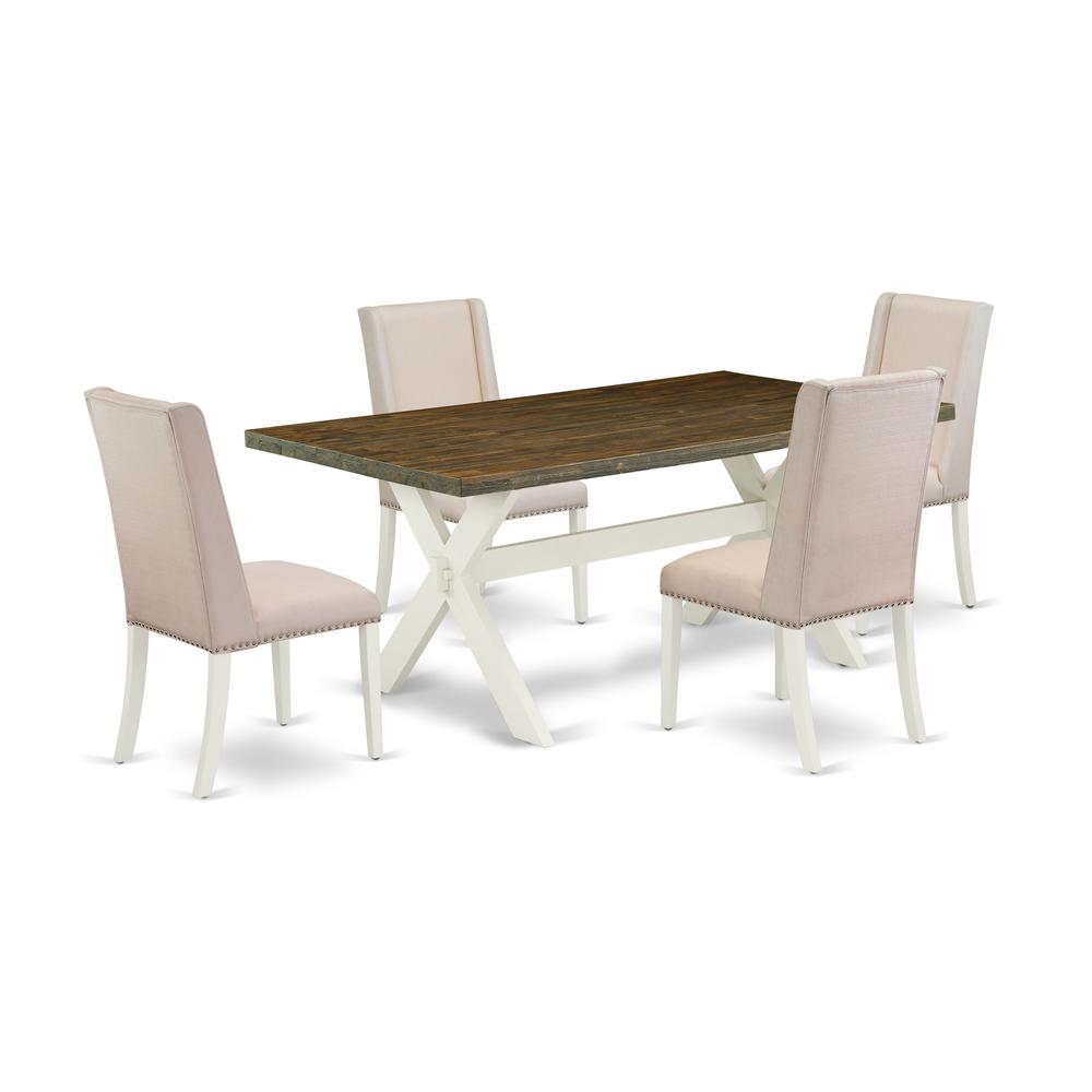 EAST WEST FURNITURE 5-PIECE RECTANGULAR TABLE SET WITH 4 UPHOLSTERED DINING CHAIRS AND RECTANGULAR DINING TABLE This dinette set includes 4 gorgeous Parson dining chairs and a wonderful wood dining table. This rectangular table is offered in an elegant Linen White finish. In addition, the Parson dining chairs in a cream linen fabric to enhance the elegance of any kitchen or dining area. Our dining set delivers great durability because this rectangular table is built from high quality Asian Wood which can bear the weight of 300 Lbs. We have created these Parson dining chairs and a modern dining table with the help of highly experienced carpenters, who generate a smooth and high-end finish to this dining room set. We try to offer innovative as well as easy to assemble products. Our high-quality kitchen set is perfect for you and your beautiful dining room as well as the kitchen area. You can use it for casual home parties or intimated gatherings. Keep enjoying East West modern furniture! FEATURES: Color of Parson dining room chairs: Cream Color of Dining Room Table Top: Distressed Jacobean Color of Kitchen Rectangular Table Base: Linen White Wood Wood Dining Table Dimensions: Length 60; Width 36; Height 30 Padded Parson Chairs Dimensions: Length 24; Width 19; Height 39 Package Include: 4 Dining Chairs and a rectangular rectangular dining table