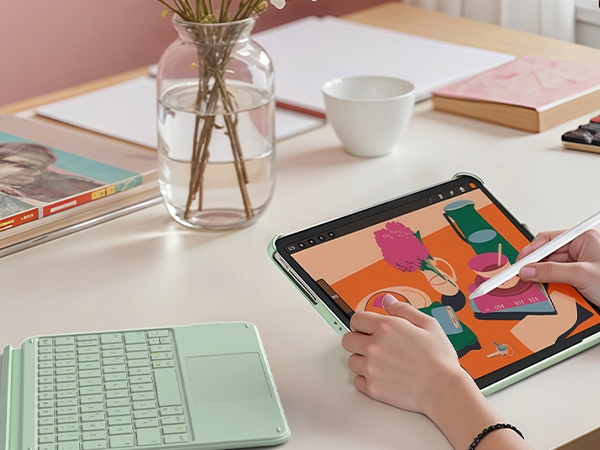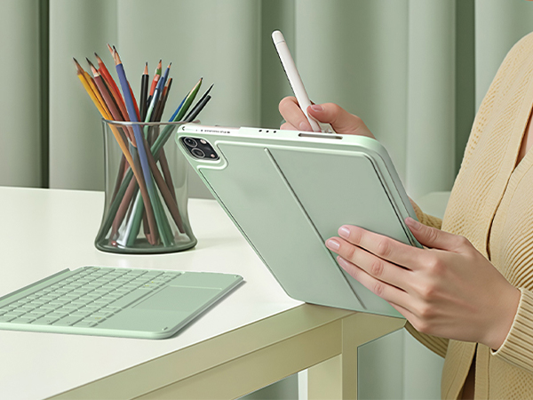Die Tastatur und die iPad Schutzhülle sind magnetisch verbunden und lassen sich leicht in nur 1 Sekunde abnehmen. Das Rückenpaneel unterstützt sowohl horizontale als auch vertikale Ansichten und erfüllt Ihre Multi-Winkel-Anforderungen für Arbeit, Studium, Filme schauen, Zeichnen, Lesen und mehr.