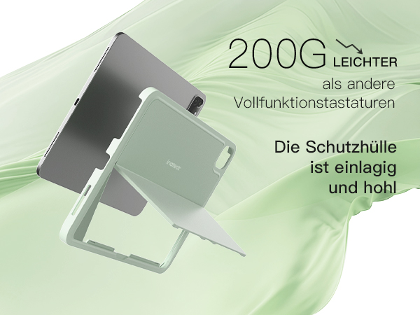 Die iPad Tastatur lässt sich magnetisch befestigen und leicht abnehmen. Darüber hinaus lässt sich der hintere Ständer stufenlos von 30° bis 160° verstellen.
