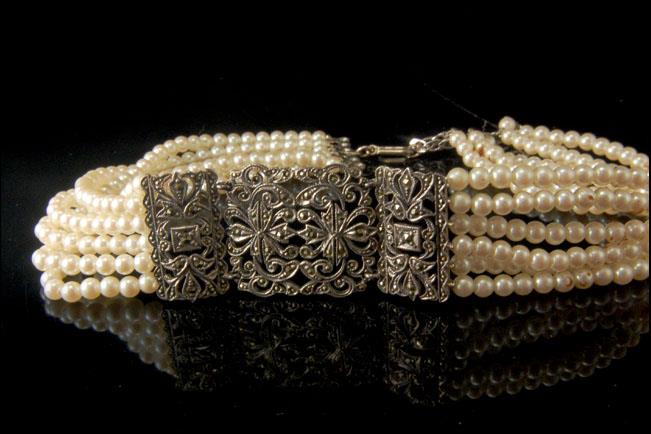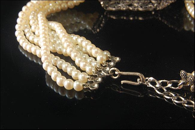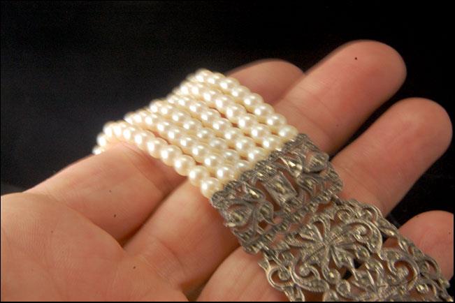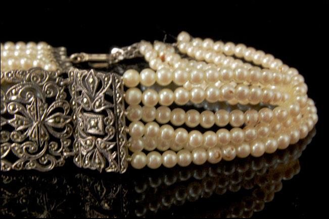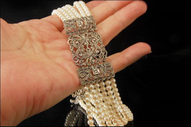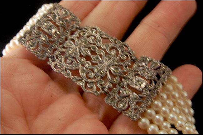 This is a very beautiful, old and unique ART DECO STERLING MARCASITE PEARL c. 1920 choker necklace. The chker has a marvelous marcasite sterling center shape with 6 strand white pearl (bottom has STERLING). It measures