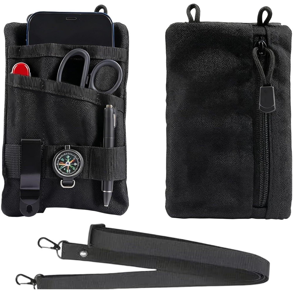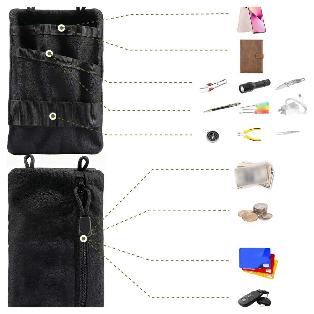 * Stockage organisé : la pochette comprend plusieurs compartiments, tels qu'un emplacement supérieur pour téléphone pour les appareils jusqu'à 6,5 pouces, des emplacements pour outils pour des articles tels que des lampes de poche et des couteaux de poche, et une poche inférieure spacieuse pour les cartes et l'argent, garantie que tous vos éléments essentiels sont soigneusement classés et facilement accessibles.