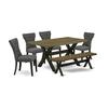 EAST WEST FURNITURE 6-PIECE DINETTE SET WITH 4 MODERN DINING CHAIRS - KITCHEN BENCH AND RECTANGULAR MODERN DINING TABLE This modern dining table set includes 4 wonderful Upholstered Dining Chairs, a beautiful indoor bench, and an outstanding wood table. This wood table is offered in an elegant Wire Brushed Black finish. In addition, the Parson dining chairs in a Gotham Gray linen fabric and amazing Distressed Jacobean wood bench top to enhance the elegance of any kitchen or dining area. Our dinette set delivers great durability because this modern dining table and dining bench is built from high quality Asian Wood which can bear the weight of 300 Lbs. We have created these Parson Chairs and rectangular dining table, indoor bench with the help of highly experienced carpenters, who generate a smooth and high-end finish to this kitchen table set. We try to offer innovative as well as easy to assemble products. Our high-quality dining room set is perfect for you and your beautiful dining room as well as the kitchen area. You can use it for casual home parties or intimate gatherings. Keep enjoying East West modern furniture! FEATURES: Color of Parson Chairs: Gotham Gray Color of Modern Dining Table Top: Distressed Jacobean Color of Kitchen Rectangular Table Base: Wire Brushed Black Color of Kitchen Bench Top: Distressed Jacobean Color of Wood Bench Base: Wire Brushed Black Wood Dining Table Dimensions: Length 60; Width 36; Height 30 Upholstered Dining Chairs Dimensions: Length 21; Width 17; Height 35 Dining Bench Dimensions: Length 60; Width 15; Height 18 Package Include: 4 Parson dining chairs and a kitchen rectangular table and a stunning Indoor Bench
