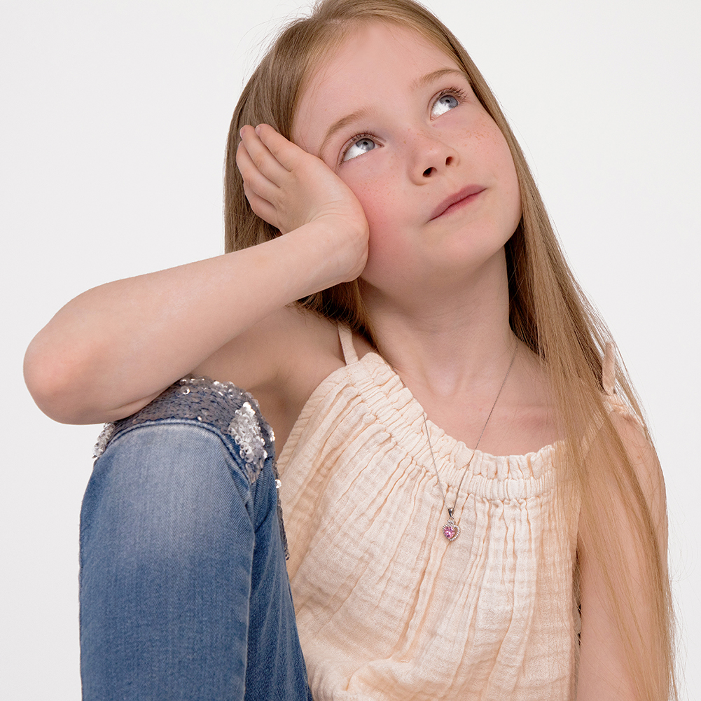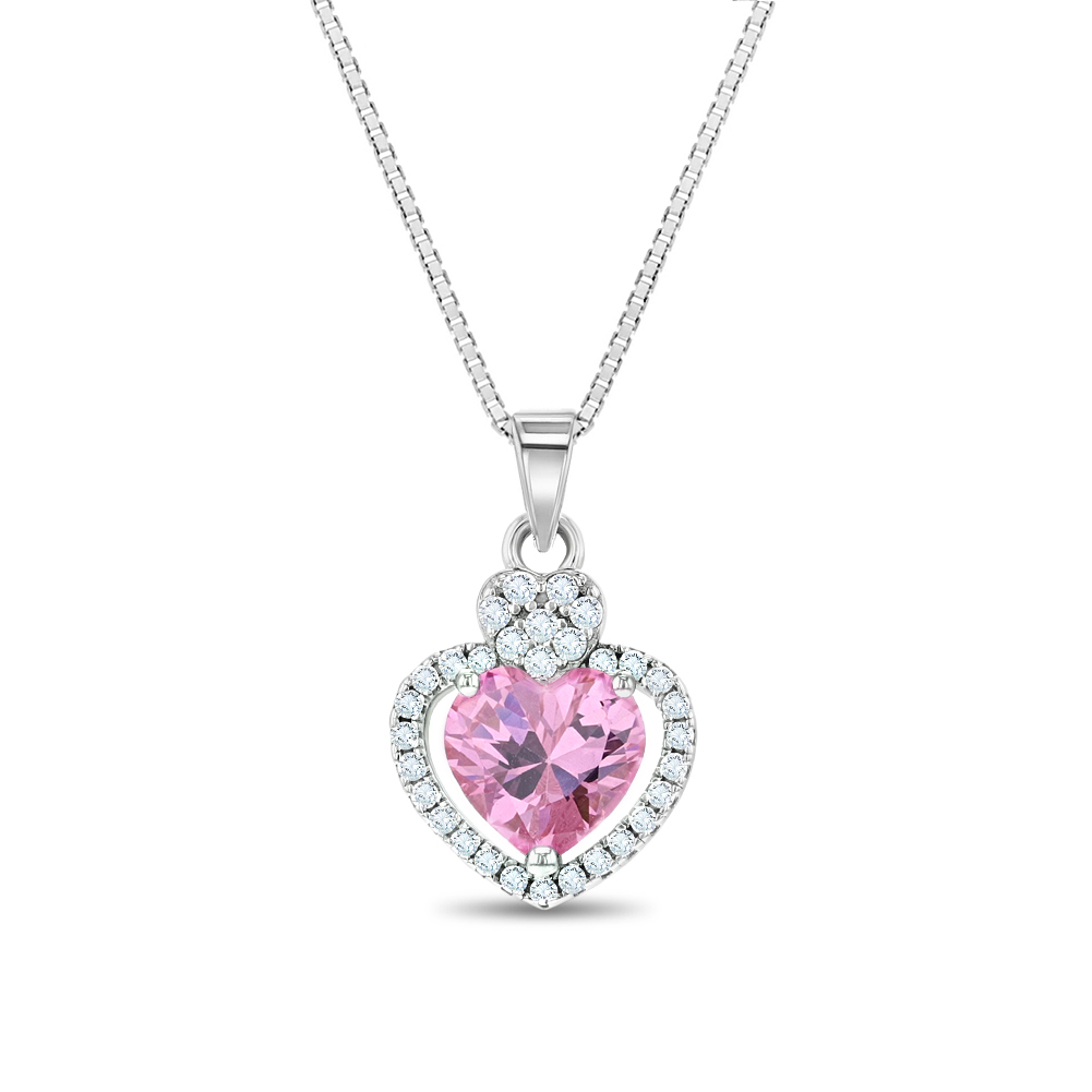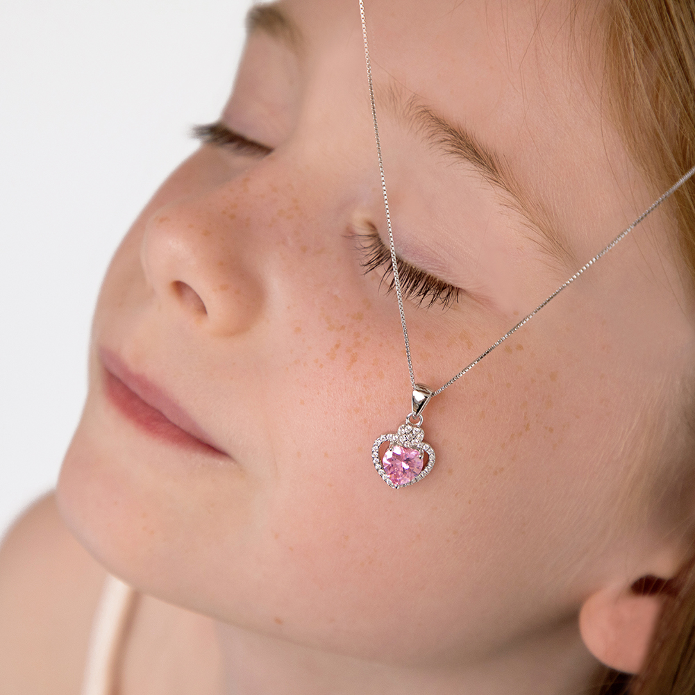Sweet and delicate, we are in love with this pink and clear cubic zirconia silver heart pendant necklace for girls. Made from 925 sterling silver, this dainty heart pendant necklace shines bright with a beautiful pink cz at the center. Your little girl will love to wear it with her favorite dress. This princess heart pendant comes with a 16" necklace made of 925 sterling silver. Perfect as Valentines Day gift or as a Birthday present for her. Gift box included.