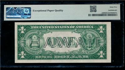 If you were looking for a certified 65EPQ gem uncirculated 1935A $1 Hawaii note, you found one! No tears, stains, folds, or other problems. The fresh paper jumps out at you. The brown seal and Hawaii overprint on the back are beautiful. This is the slightly more rare P-C block as opposed to the most common S-C block. You don't have to trust someone's description of grade when you can trust PMG. This note is EPQ, and you can clearly see the originality through the holder.
