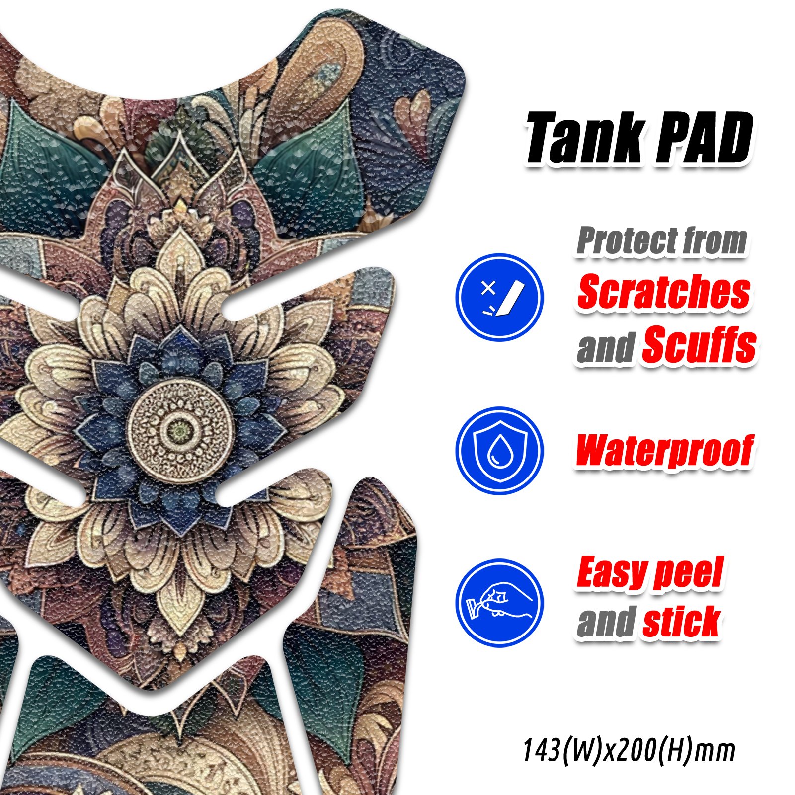MC Motoparts Tank Pads are made by high quality vinyl laminated by anti-slip texture plastic protective layer