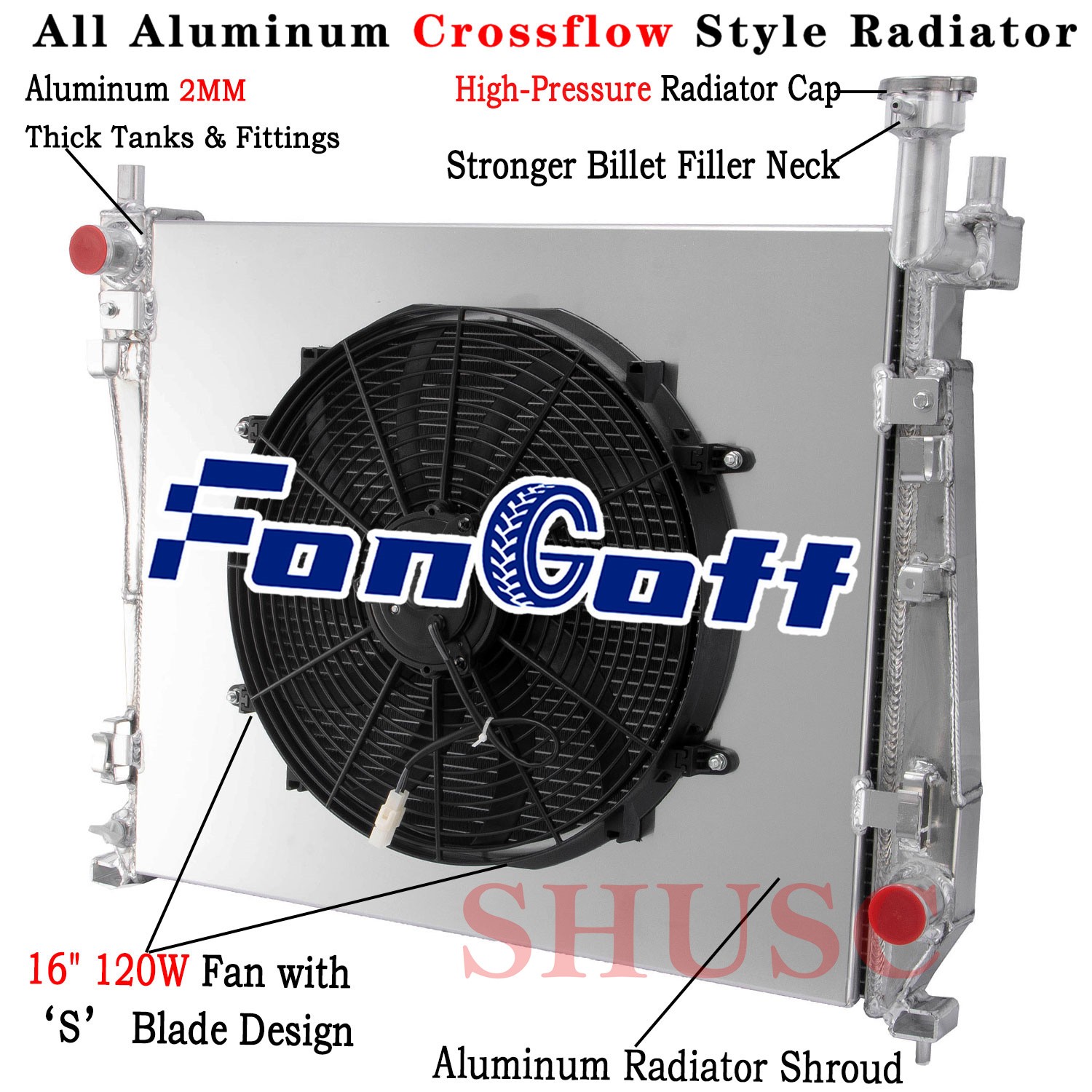 Fan Specification: Diameter : 16'' (Blade to Blade) Voltage: DC 12 Volts Wattage: 120W Number of Blades: 10 S-Type blades Maximum Fan CFM(Cubic Feet per Minute): 3,000 cfm Maximum Fan RPM(Revolution(s) Per Minute): 2000±10% Amp Draw: 10amp S-Type Blade pull push design, to make air flow more efficient and bring more cooling Effect Powerful 120 watt motor will keep your engine cool.