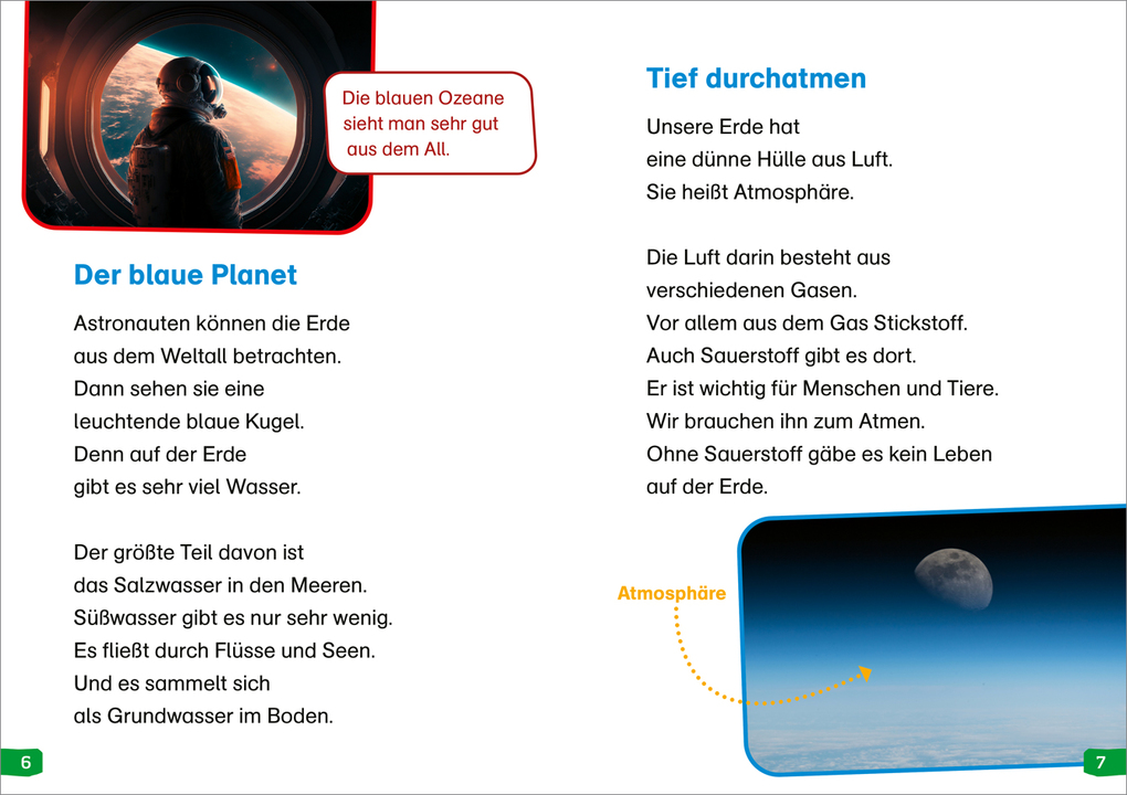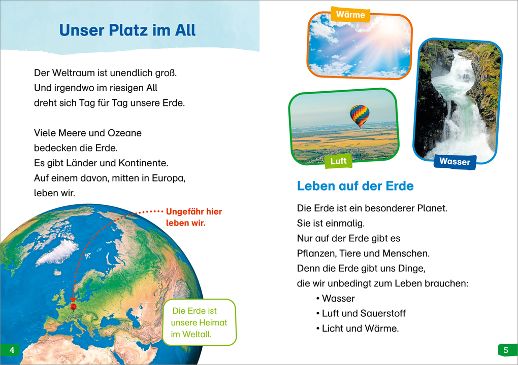 Die Erde ist unser Platz im Weltall. Seit Millionen von Jahren entwickeln sich Pflanzen, Lebewesen und auch die Erde selbst. Die Kontinentalplatten, das Salz- und Süßwasserwasser, die Atmosphäre - alles ist im Wandel. Leseanfängerinnen und Leseanfänger erfahren, wie die Erde aufgebaut ist, welche Kontinente und Ozeane es gibt und wie Vulkane entstehen. Wie fügt sich die Erde ins Sonnensystem ein und welche Bedeutung hat der Mond? Mit schönen Bildern, großer Schrift und einfachen Sätzen macht das Lesenlernen richtig Spaß.
