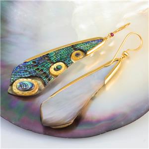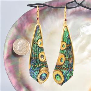 HAND-CARVED DRAGONFLY WINGS SHELL EARRINGS, EMERALD & GOLD VERMEIL over STERLING SILVER