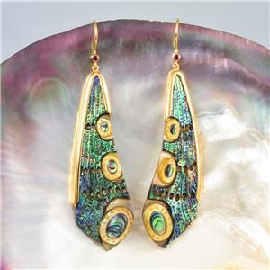 18K Gold Vermeil over Sterling Silver hook earrings with a pair of spectacular carved multicolor shell Dragonfly wings and genuine natural green Emerald gemstones.