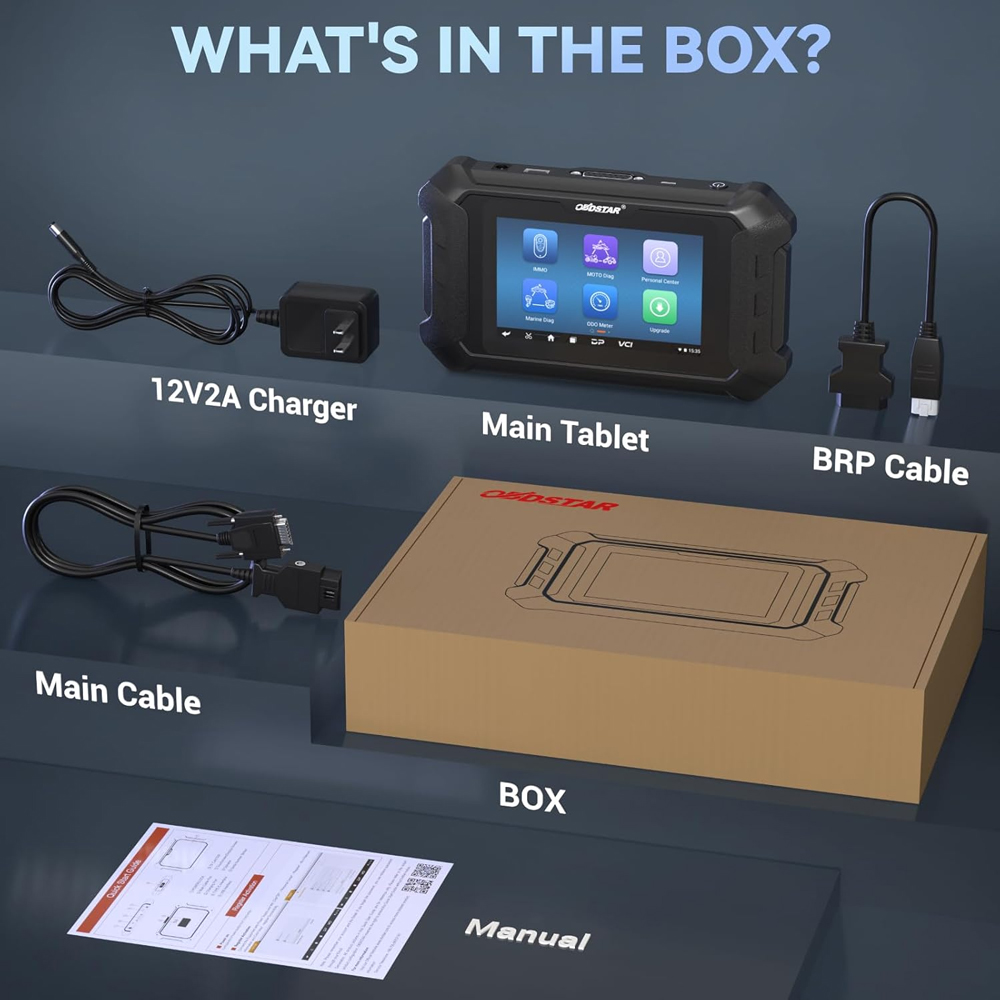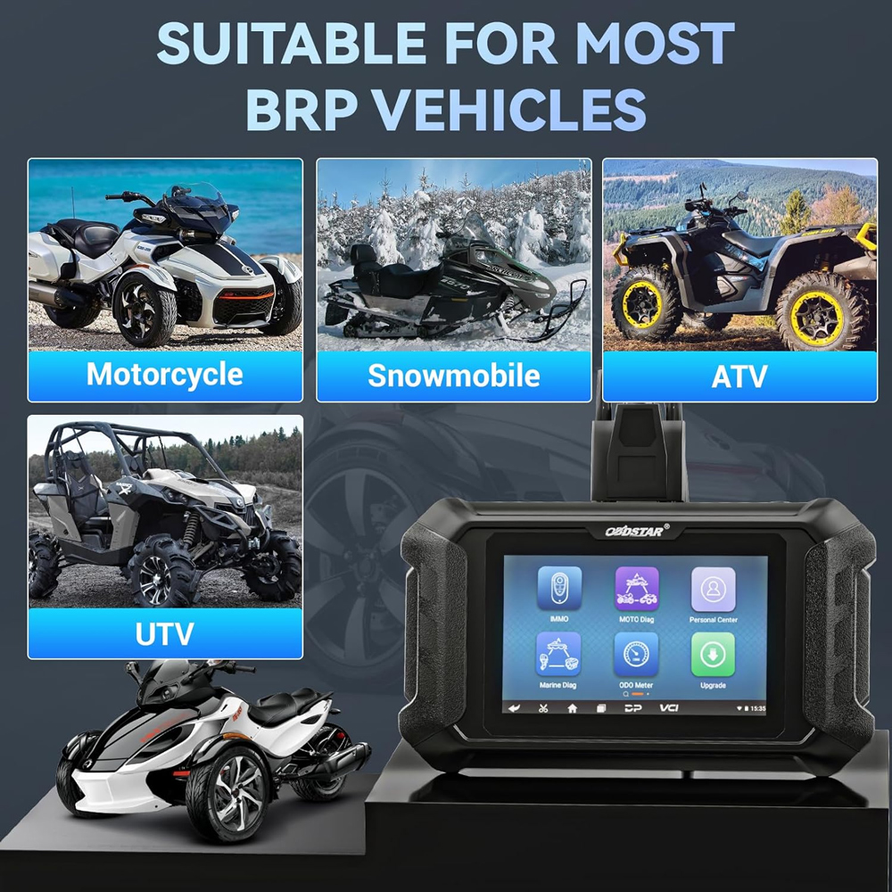 an account, enter the one-click upgrade to download the software. Functions 1. New android 5.1.1 operation system; 2. Simple and intuitive menu guidance allows you to quickly master the equipment operation; 3. Provide complete diagnostic functions including code reading, code clearing, data flow, action test, setting, coding etc; 4. Menu arbitrary selection is more convenient and quicker; 5. Record and play back real-time data flow, quickly and accurately locate sensor and component faults; 6. Wi-Fi connection to the internet, one-click software upgrade; 7. One-click remote function, OBDSTAR technical staff remote assistance. 8. Supported languages: EN, ES, PT, FR, DE, IT, PL, RU, TR, ID, FA, TH, VN. 9. Support BRP& BRP BOAT diagnosis and k-ey progarmming (Note: For BRP BOAT k-ey progarmming function only support 2006-2017) 10. One year free update After one year update subscription price: Not expired or expired within 7 days update 48 USD/year, over 7 days update 80 USD/year Advanced function 1. The first fault guidance, help data, technical bulletin, diag socket etc help you diagnose accurately and efficiently; 2. Diversified data flow display modes such as text, waveform diagram and instrument diagram, allowing you to easily analyze faults; 3. Automatic scanning, automatic VIN recognition, control module progarmming and coding, E-C-U setting, instrument coding, tire pressure monitoring system, maintenance light reset, CO adjustment, idle speed adjustment, A/F value reset, ABS control unit setting, EOL mode, transmission memory reset, clear computer memory etc. Motorcycle/snowmobile/ATV/UTV support series BRP Motorcycle k-ey progarmming support series BRP Function Display 1) Main Page/Brand Supported (Please note: ODO Meter function is not included and requires additional payment for authorization) 2) Help Data/Technical Bulletin 3)Supported Systems List/Vehicles List Specifications: Operation system Android 5.1.1 CPU RK3128 quad-core ARM cortex A7 Battery 2600mA, rechargeable polymer lithium battery Extension memory card 32G micro SD (TF) card supported LCD resolution 800*480 Touch screen Capacitive touch screen Wifi Supported Storage temperature -20℃~70℃ (-4℉~158℉) Weight About 700g Dimension 198mm*115mm*31mm Package Includes: 1pc x ISCAN for BRP(Can-am) main tablet 1pc x M001 Main cable 1pc x for BRP cable 1pc x 12V 2A Charger Please note: Optional accessories are not included in the package!