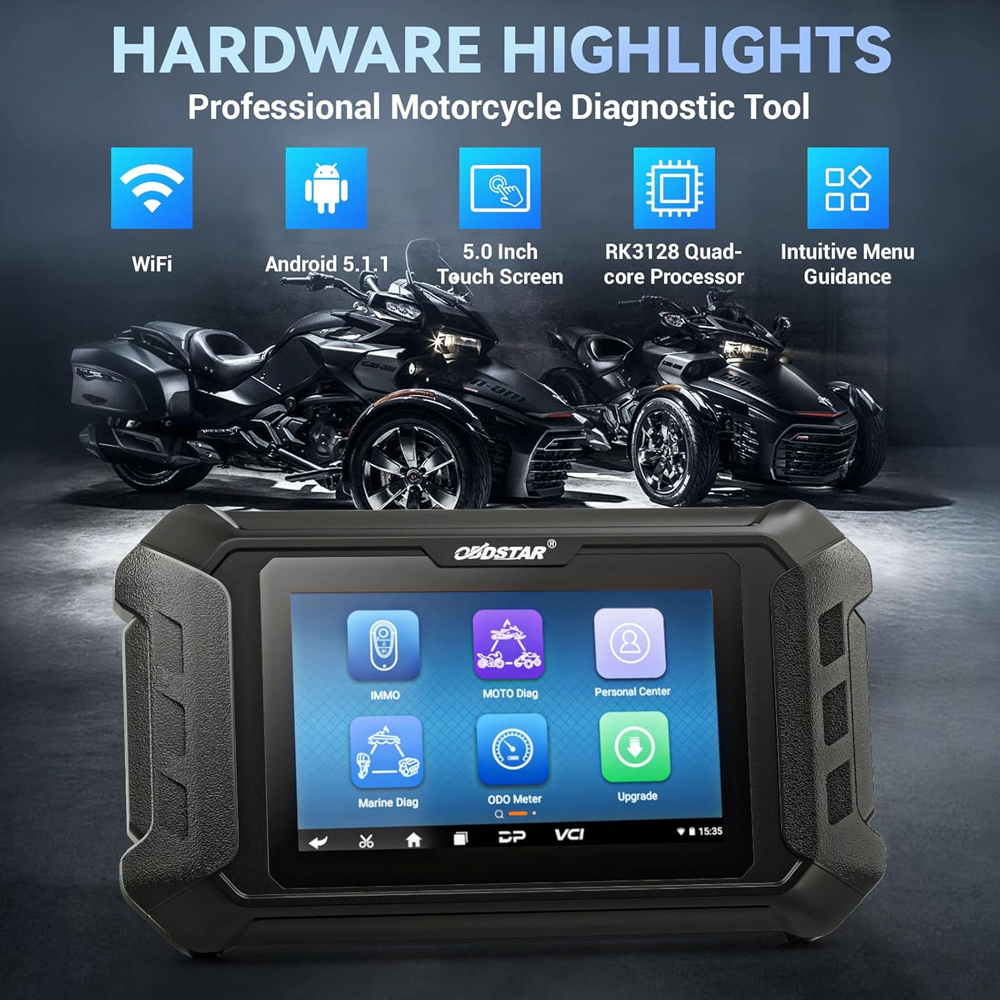 OBDSTAR ISCAN for BRP(Can-am) Motorcycle Diagnostic Equipment for BRP ISCAN for BRP(Can-am) is a portable tablet which has super performance and industrial appearance design specialized for BRP. It is a new generation of motorcycle diagnostic equipment tailored for customers. Based on RK3128 quad-core processor and equipped with a 5.0-inch capacitive touch screen, brings customer professional diagnosis experience. Note: There is no software on the device. After registering