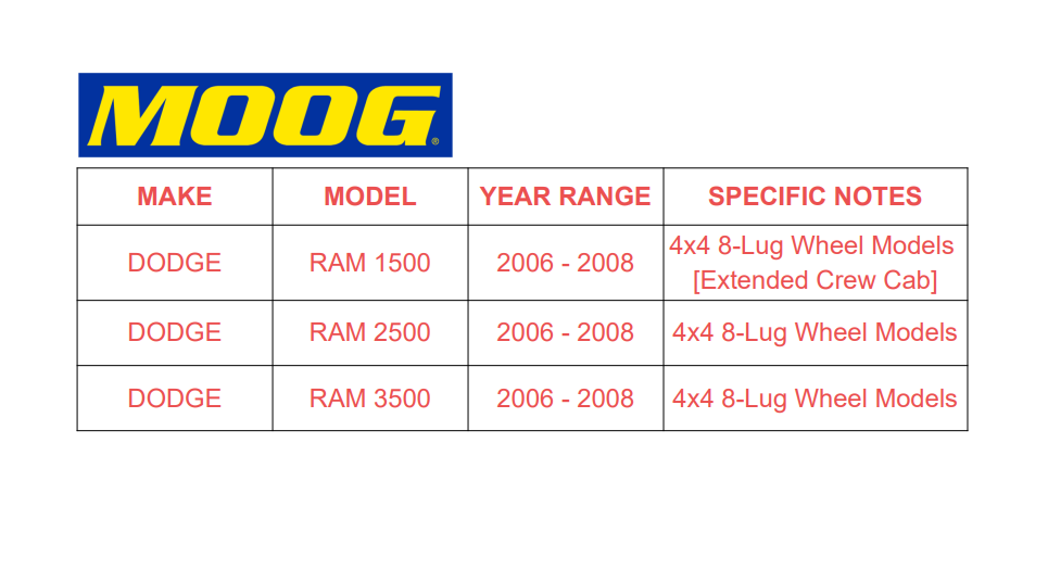 | DODGE | RAM 3500 | 2006 - 2008 | 4X4 8-Lug |
