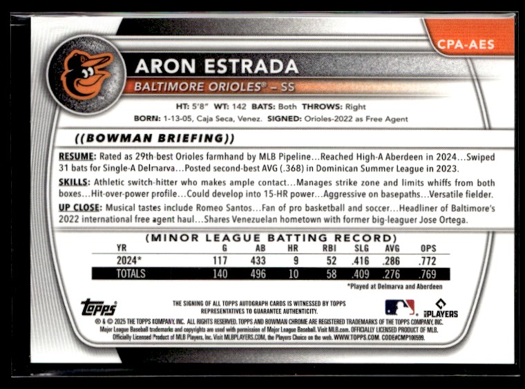 2025 Bowman Draft Chrome 1st Auto Aron Estrada Auto Baltimore Orioles #CPA-AES