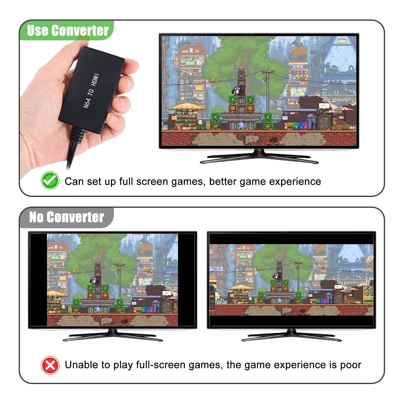 Notes: Only video signal transmission cannot improve video quality. Only convert Nintendo 64/SNES/NGC to HDMI, does not support HDMI to AV. HDMI to AV is not supported, only Nintendo 64 will be converted to HDMI. 4K and 3D are not supported.